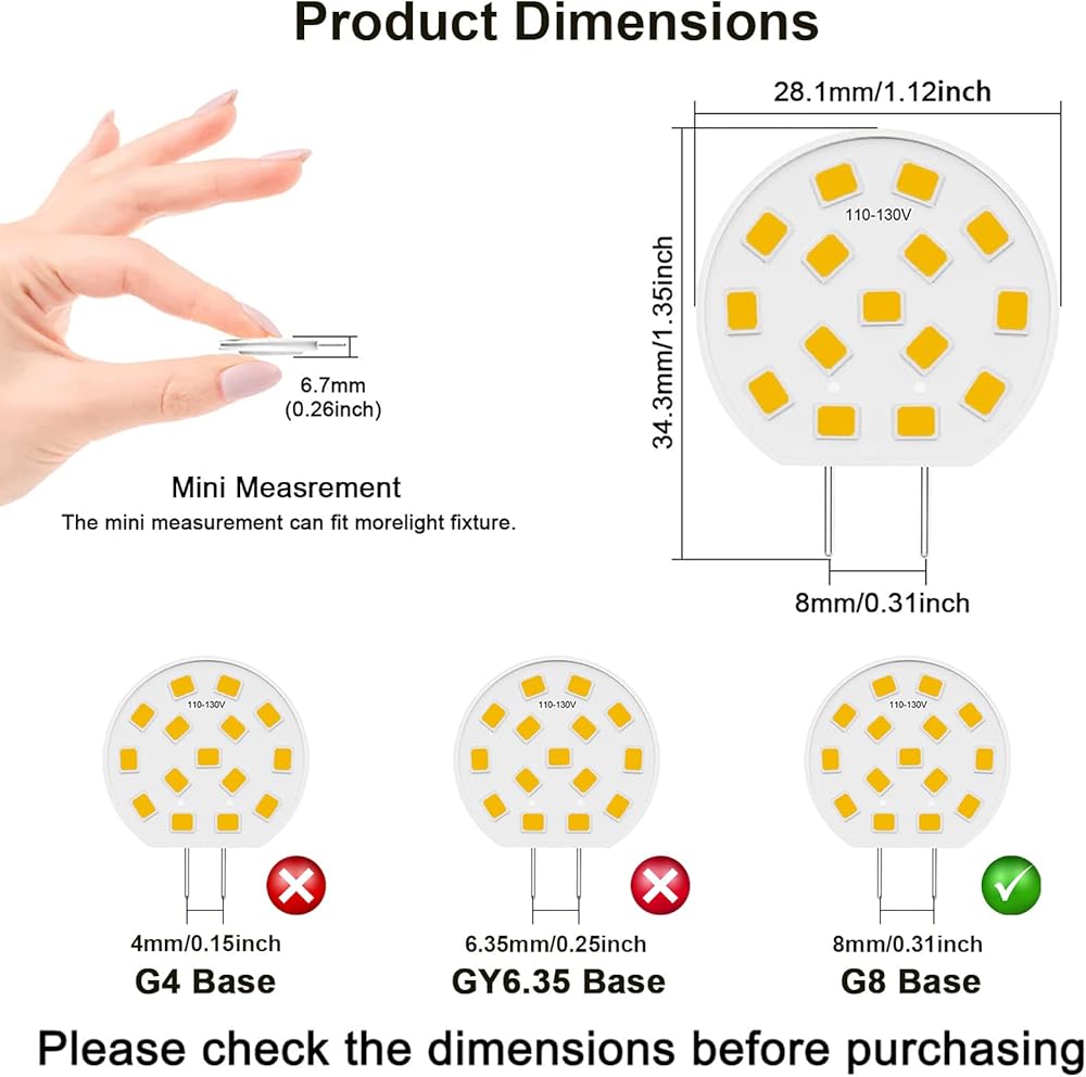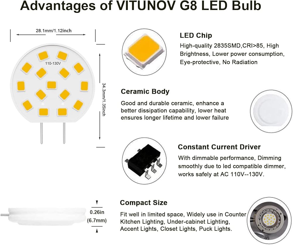 ENERGY SAVING: VITUNOV G8 LED bulbs 3 watts enough to replace 20 watt to 25 watt G8 halogen bulb, Only one side shines, The light is more concentrated and brighter than other ordinary G8 Light Bulbs , save 90 percent on your energy bill.