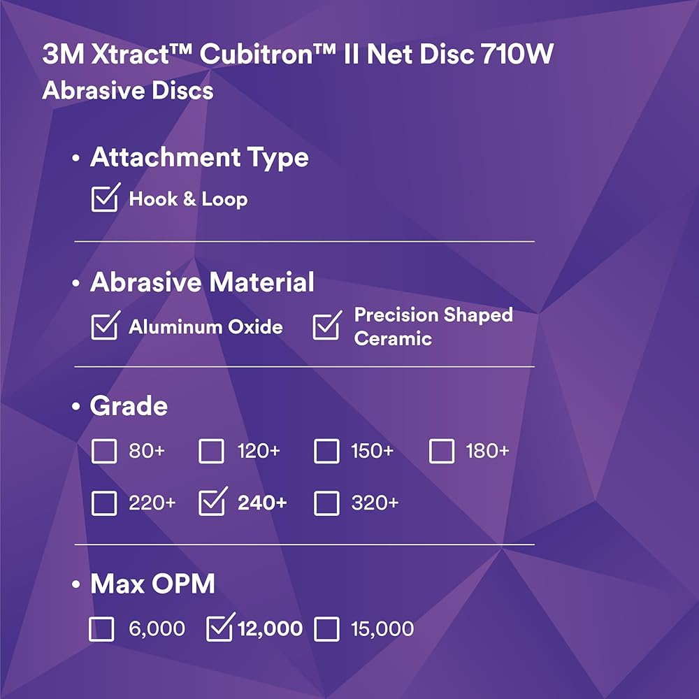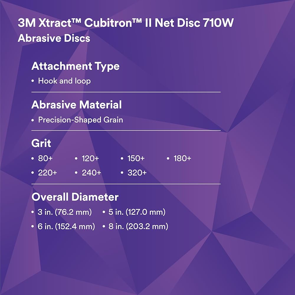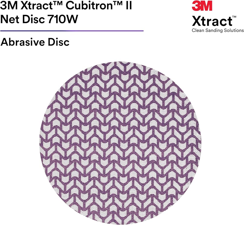 Dust extraction meets industry-leading cut-rate in 3M Xtract™ Cubitron™ II Net Disc 710W. This premium sanding disc features a unique abrasive pattern on a net backing that allows for virtually dust-free sanding, with legendary 3M Precision-Shaped Grain technology. You'll finish more parts per disc with less dust in the environment, boosting productivity without sacrificing dust extraction.