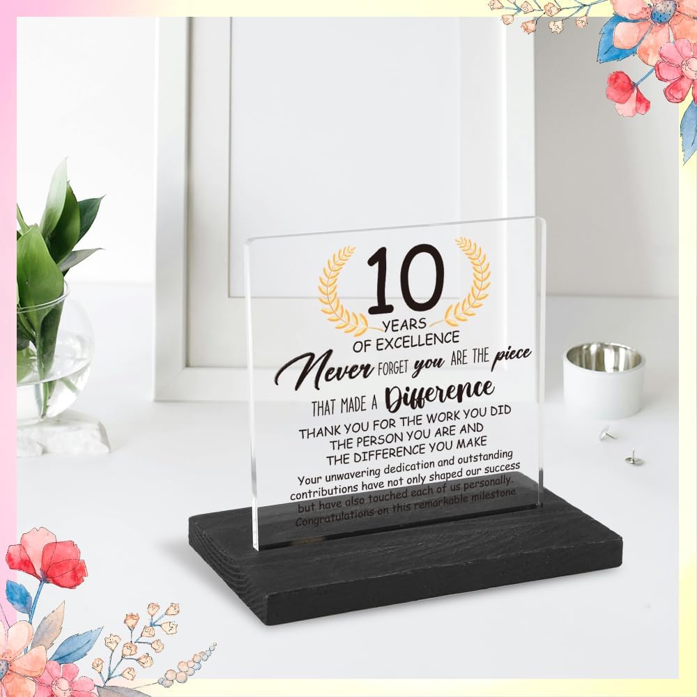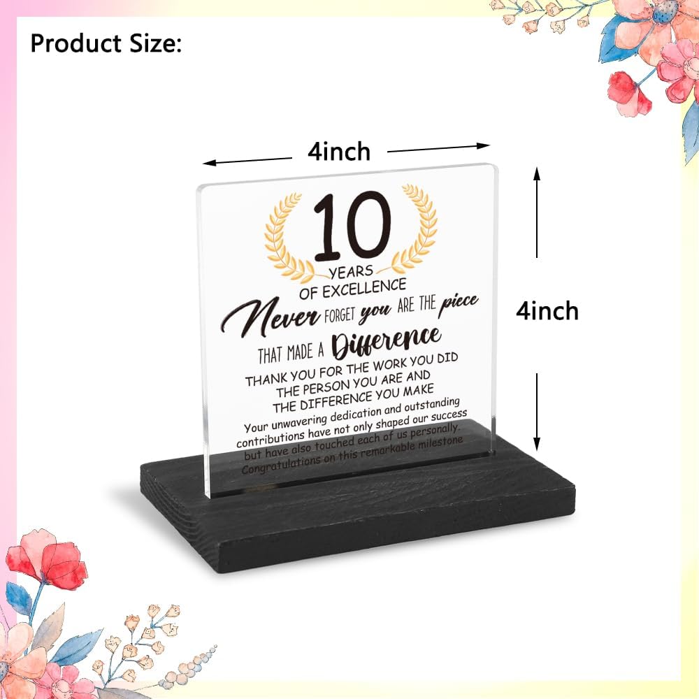 10 Years Work Anniversary Desk Decor Gifts for Employee, 10th Grade Promotion Gifts for Coworker,Modern Transparent Acrylic Desk Plaque with Inspirational Quotes, 10 x 10 x 1.5 cm,XXY108