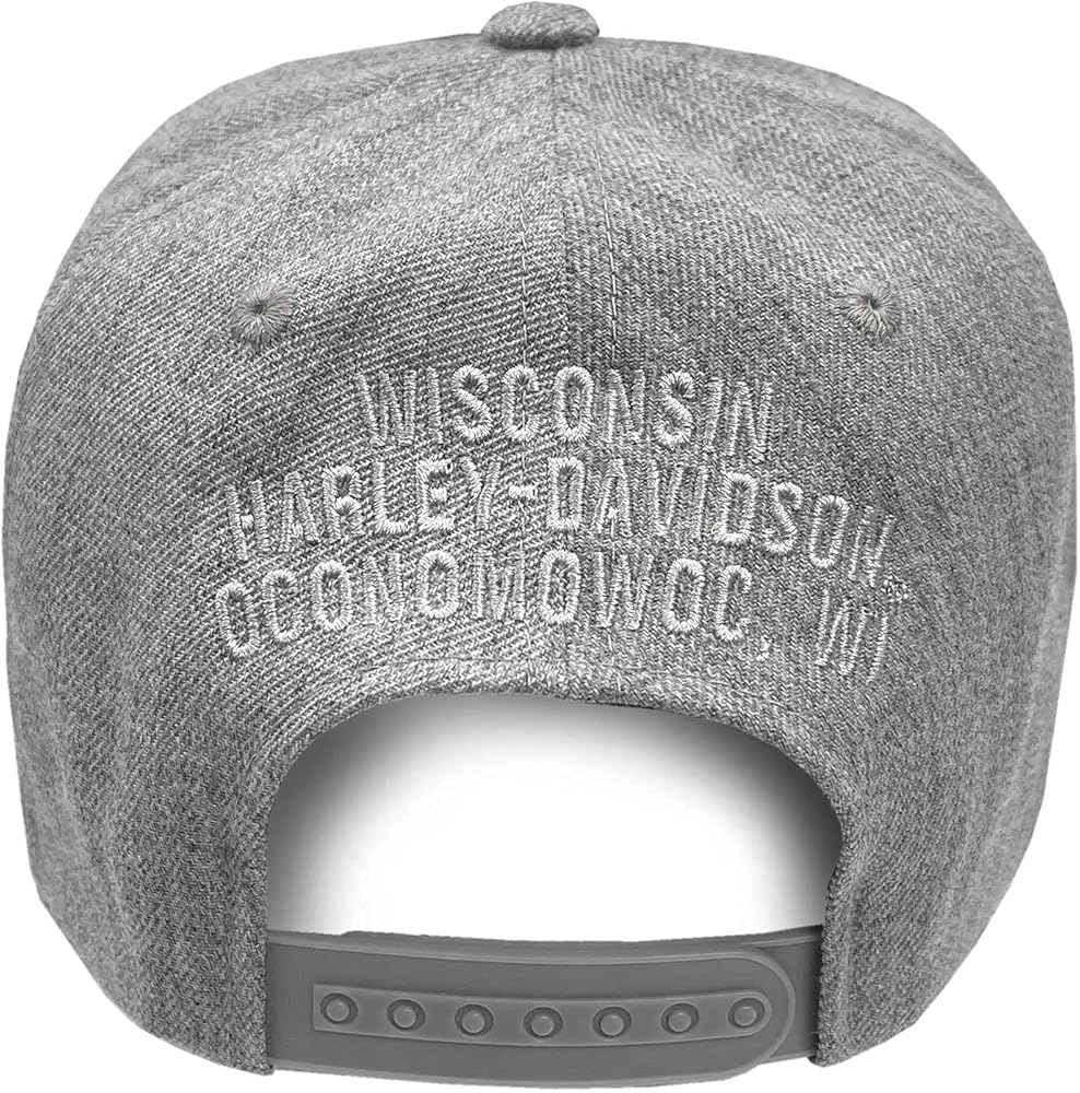 Harley-Davidson Men's Ironhead Baseball Cap - Medium Heather Gray, 5029000703. Comfortable six panel structured hat. Constructed from durable 80% acrylic and 20% wool. Awesome embroidered H-D text for a 3D look. Our Wisconsin Harley dealer name in gray stitching on back. Adjustable Snapback closure. Guys you can never have too many caps! High-quality and super comfortable hat, perfect for any Harley enthusiast.