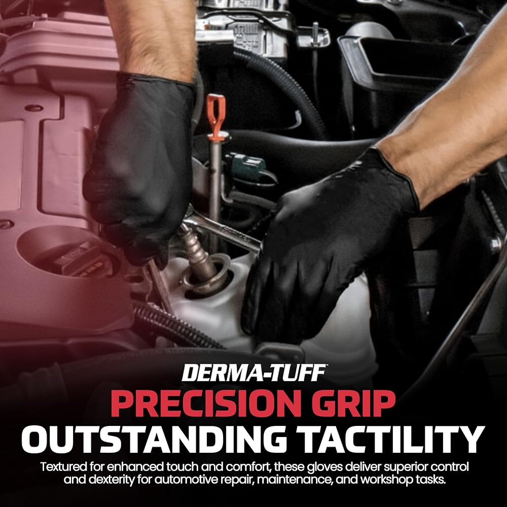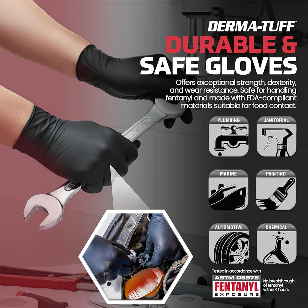 HEAVY DUTY NITRILE DISPOSABLE GLOVES: The Derma-Tuff 6 Mil Powder-Free Heavy Duty Nitrile Gloves outperform the competition with their outstanding strength, puncture and chemical resistance, and dexterity. Perfect for everyday use—including automotive, work shops, agriculture, and plumbing—these no-latex nitrile gloves will help get you through your task.