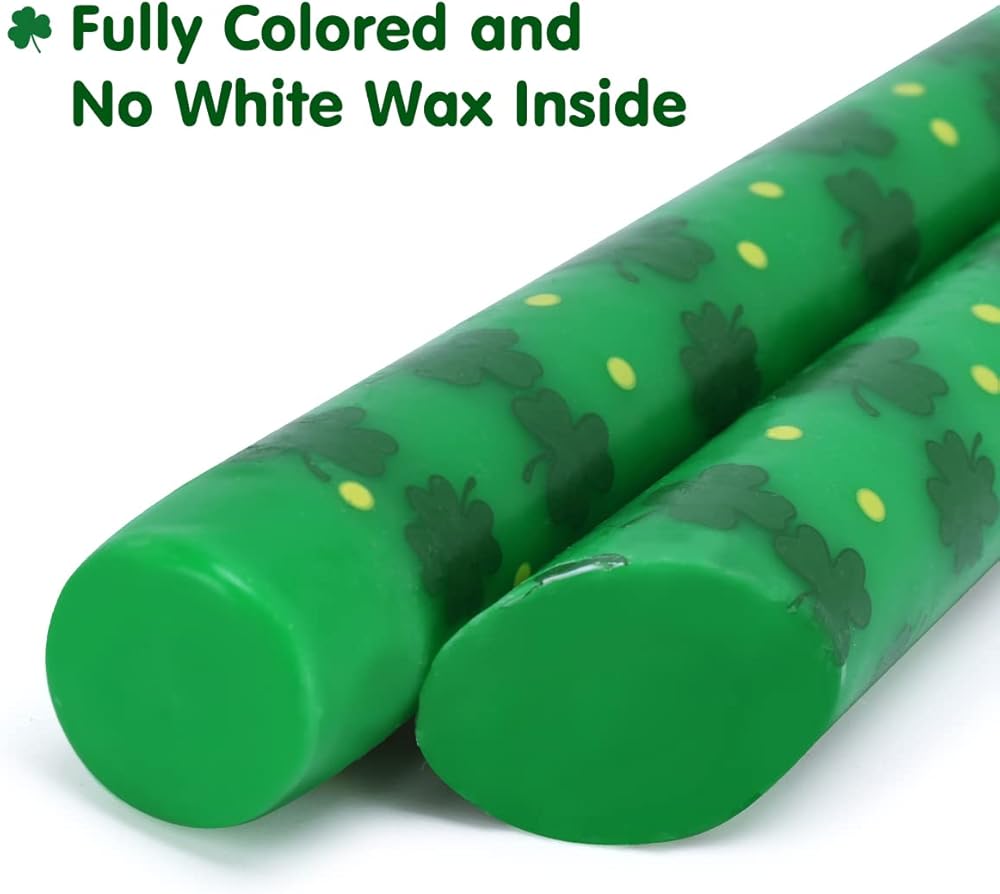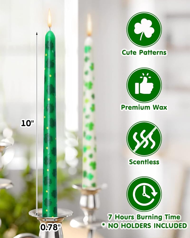 Tuitessine St. Patrick's Day Taper Candles 10 Inch Tall Set of 4 Unscented Irish Shamrock Clovers Green Candlesticks Lucky Charms Gifts Home Decor for St. Paddy's Day Party Dinner - 8 Hour Burn Time