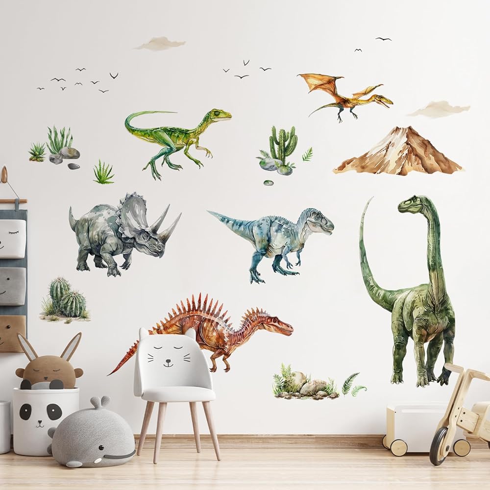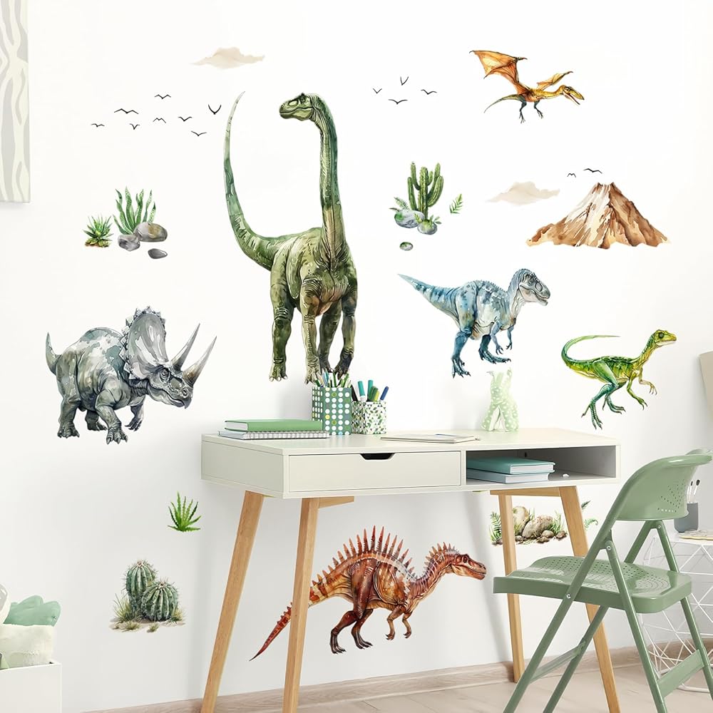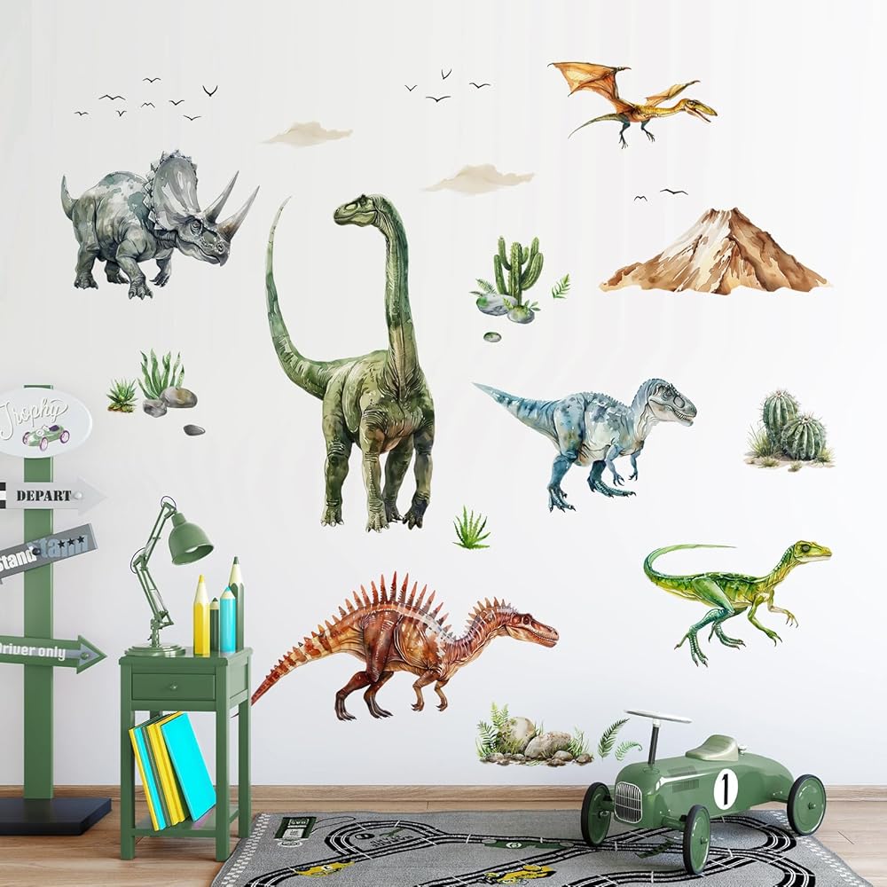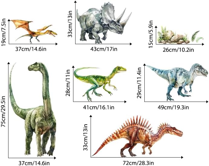 【Reliable Material】: This large dinosaur wall stickers are made of high-grade vinyl material with a removable adhesive. It's easy to peel and stick, durable, waterproof and removable without any sticky residue or marks.⭐Vinyl wall decals are removable but not re-positionable.