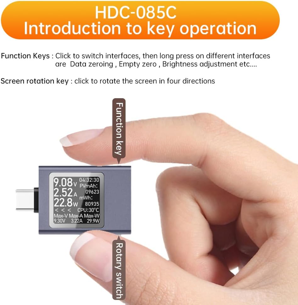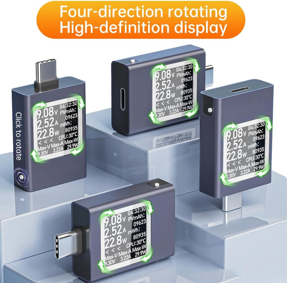 【Real-Time Peak Value Recording】USB-C tester allows you to check the max-voltage, max-current, and max-power values during charging period, easily to determine the extreme charging power of phones, chargers, power bank etc. The AT085 USB-C tester adds a gravity acceleration sensor and the display can automatically rotate the screen in 4 directions to provide you with the better reading experience(Note: Press the confirmation button 5 times consecutively to enter direction lock mode).