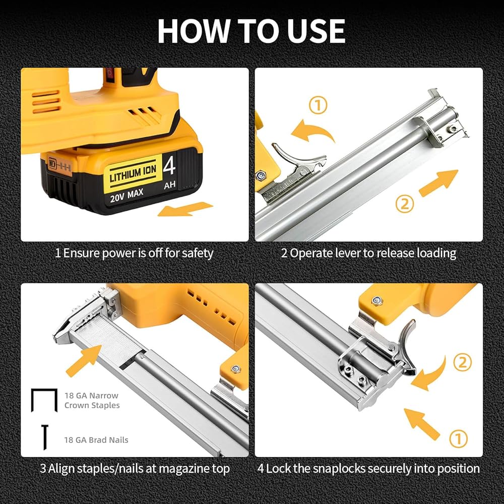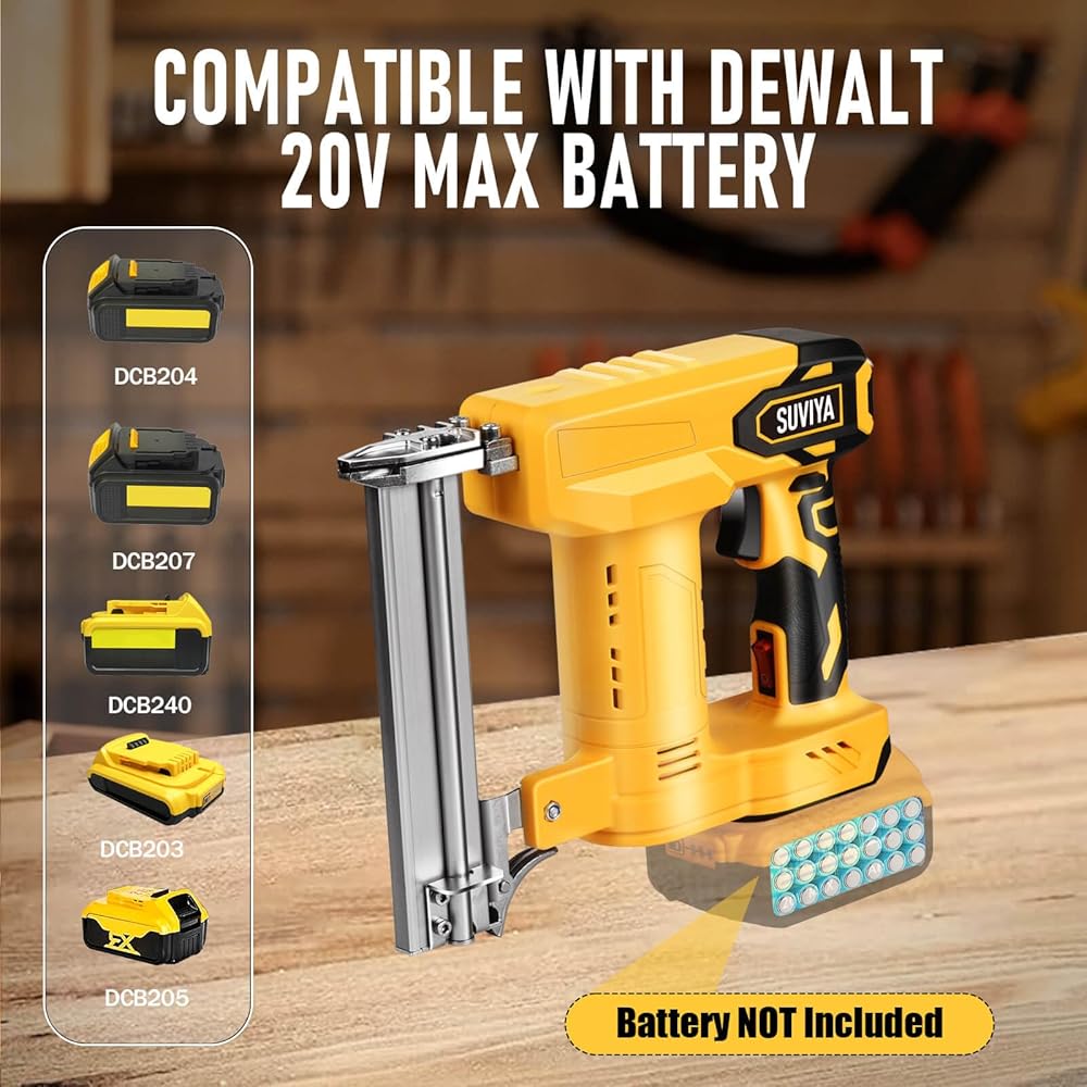 Compatible with Dewalt Batteries : The Cordless nail gun compatible with Dewalt 20V Max batteries (DCB200, DCB201, DCB203, DCB204, DCB205, DCB206). Warm : Battery NOT Included.