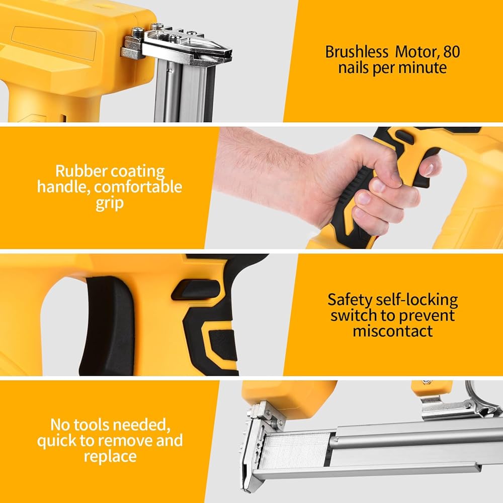 Safe & Portable Design:Easy-release magazine for quick reloading, accommodating up to 100 nails. Remarkable firing rate of up to 2-3 nails per second. With safety lock