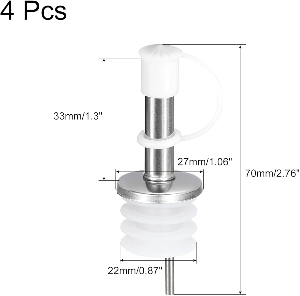 Material: Stainless Steel and Silicone; Overall Length: 70mm/2.76"; Outer Diameter: 27mm/1.06"; Plug Diameter: 22mm/0.87"; Mouth Length: 33mm/1.3"; Color: Black; Products Include: 2 x Stainless Steel Wine Pourers Liquor Pour Spouts