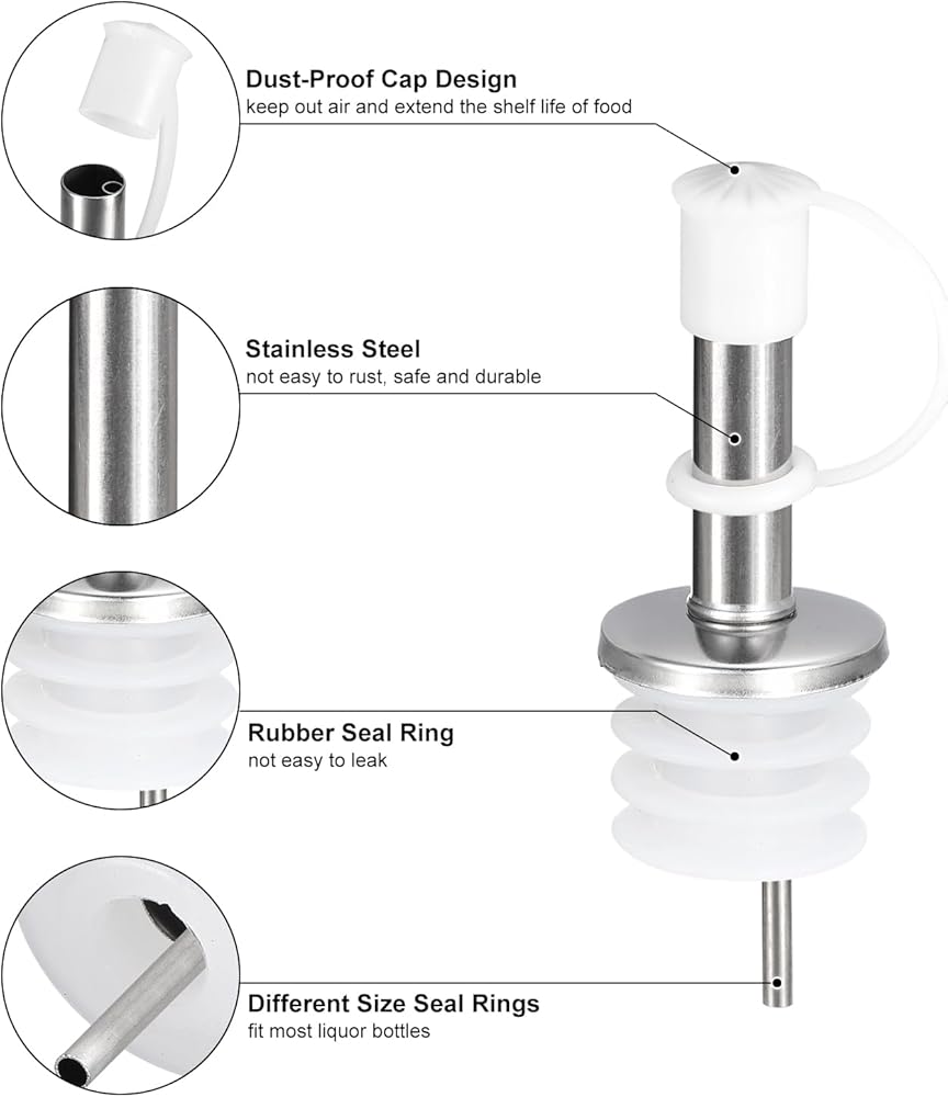 [Material Liquor Bottle Pourers] The wine pourers are made of stainless steel and silicone, are not easy to rust, and are safe, and durable. Silicone plug, keep it sealed and leak-free. Bottle pourers for alcohol keep alcohol, oil, and salad fresh.