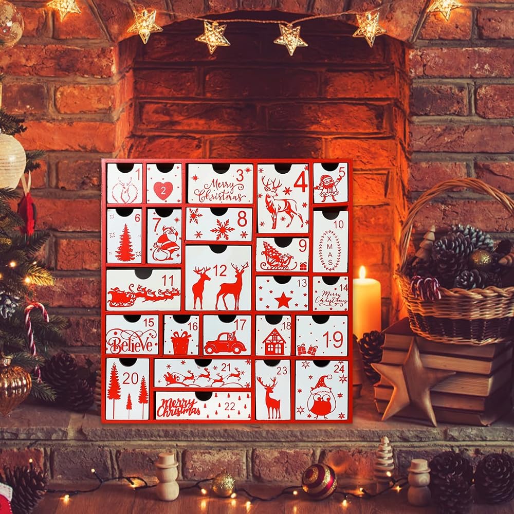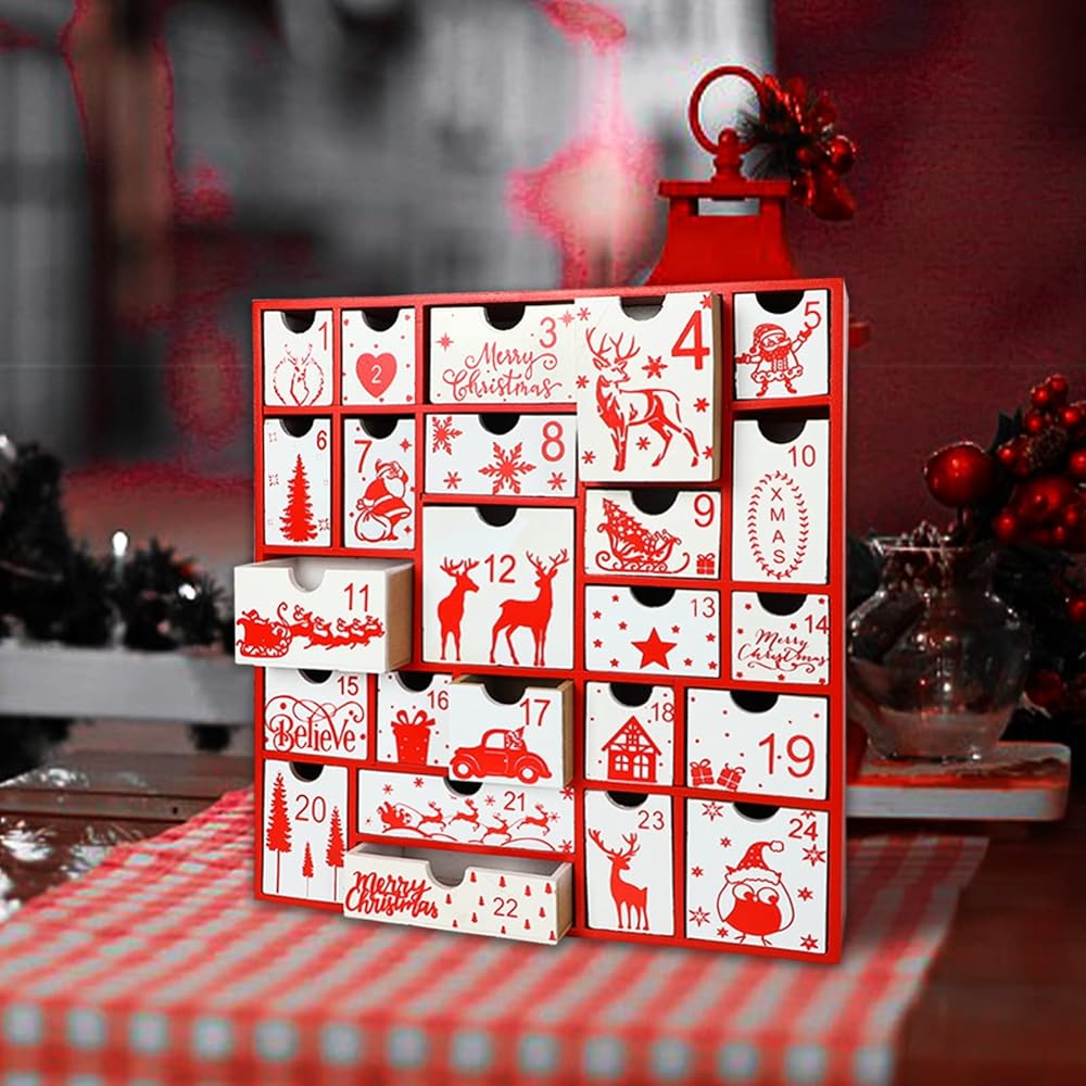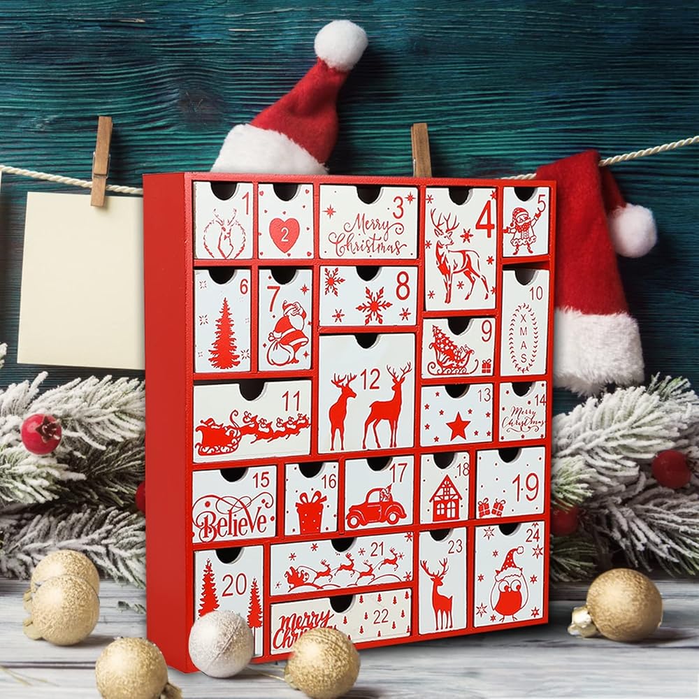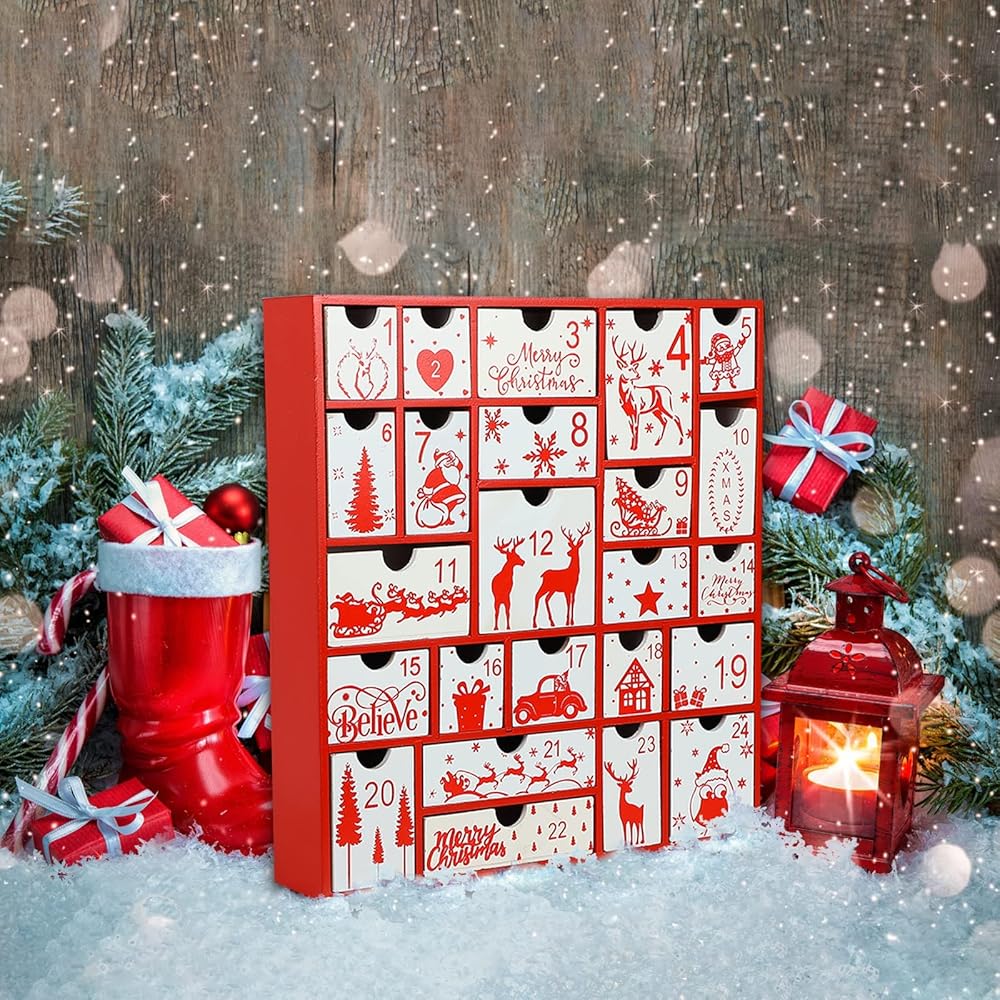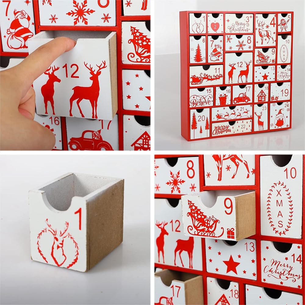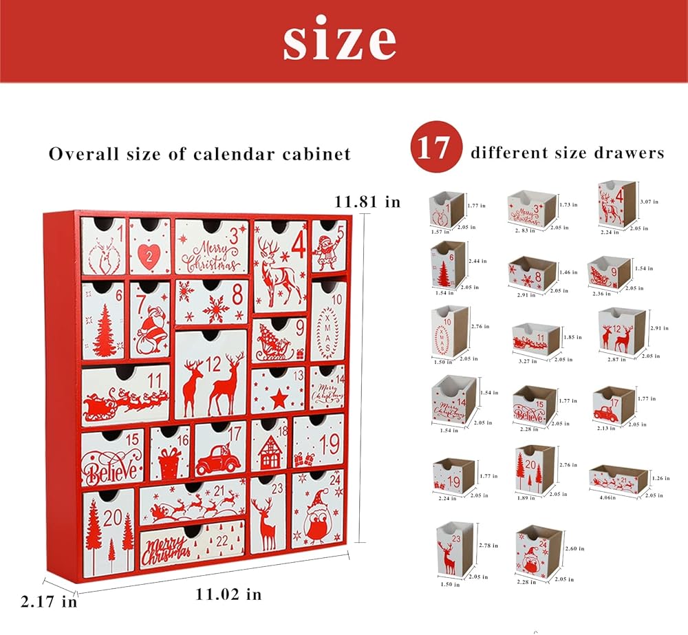 Christmas Advent Calendar - Aoutrow Christmas Calendar is designed with 24 numbered drawers which you can hide small surprises behind that kids and adults can look forward to opening each day. Such as small coins, treats, candies, toys, or even special messages. Each drawer measures 1.73" deep.