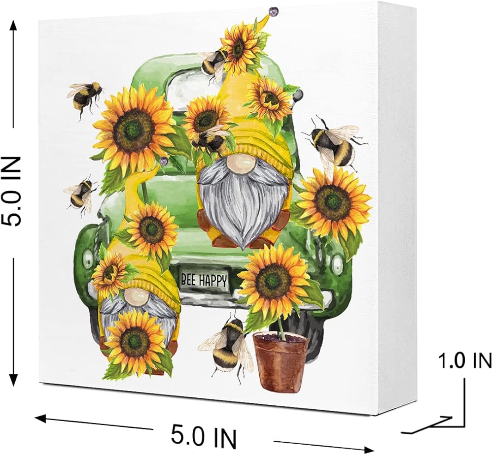 Summer Desk Decor,Sunflower Gnome on Retro Green Truck Wooden Plaque Sign Desk Decor,Rustic Floral Gnome Wood Block Sign Desk Decorations for Summer Home Living Room Office Garden Shelf Table Decor