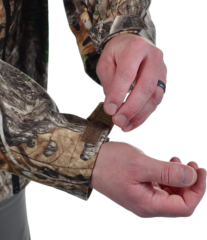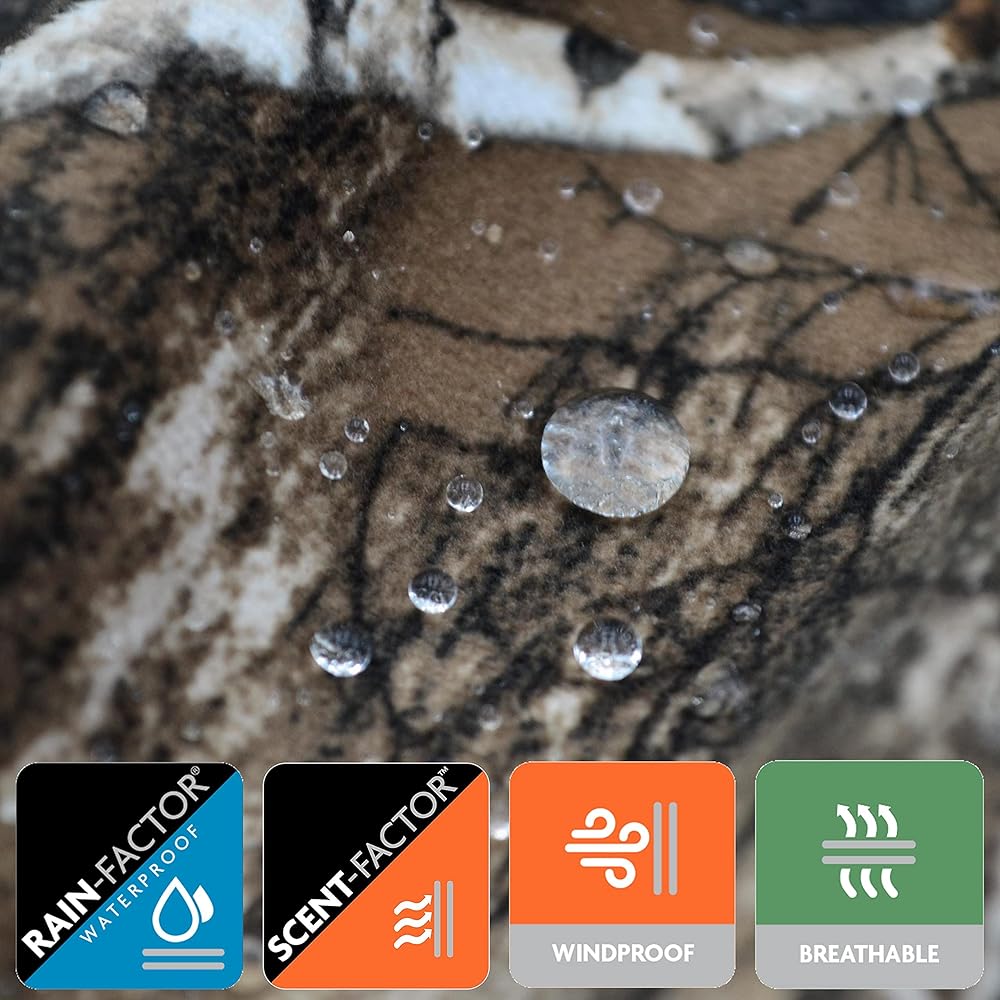 Lightweight Soft and Quiet Tricot with Spandex for extra stretch and freedom of movement with Scent-Factor and Rain-Factor Waterproof Technologies.