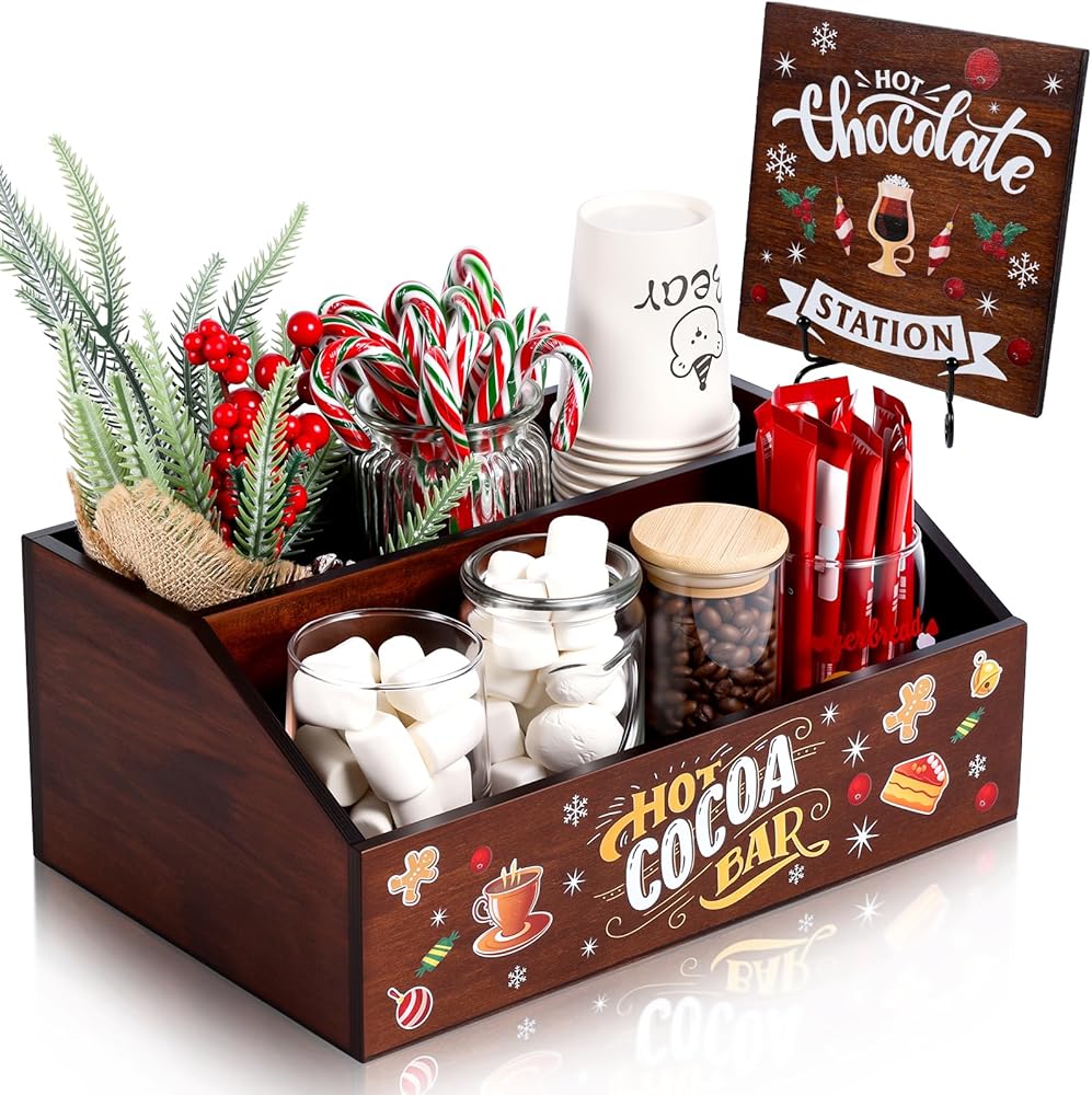 Double Tier Hot Cocoa Bar Wood Storage Box: This Christmas hot chocolate bar decorative box for home decor is Bright red as the main color, adding a typical Christmas pattern, such as snowflakes, hot drinks; add a festive touch to your decorations, attracting people's attention