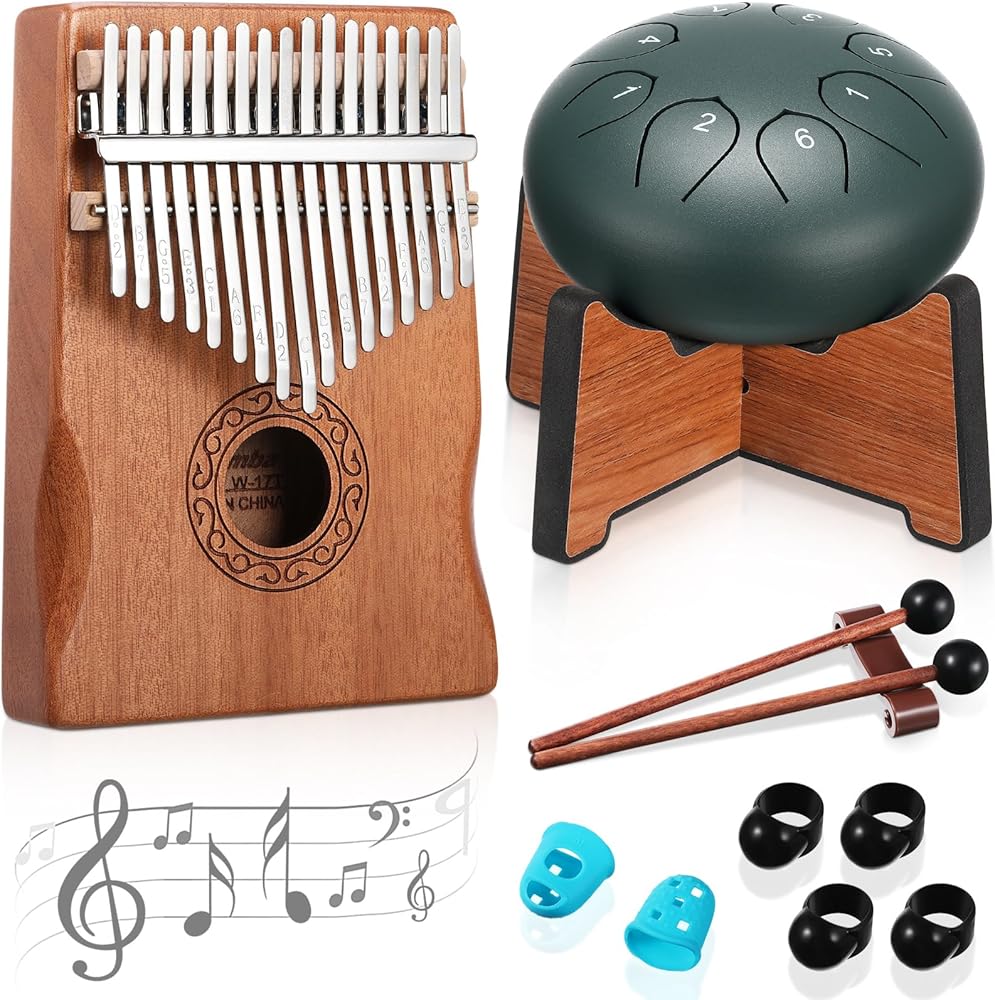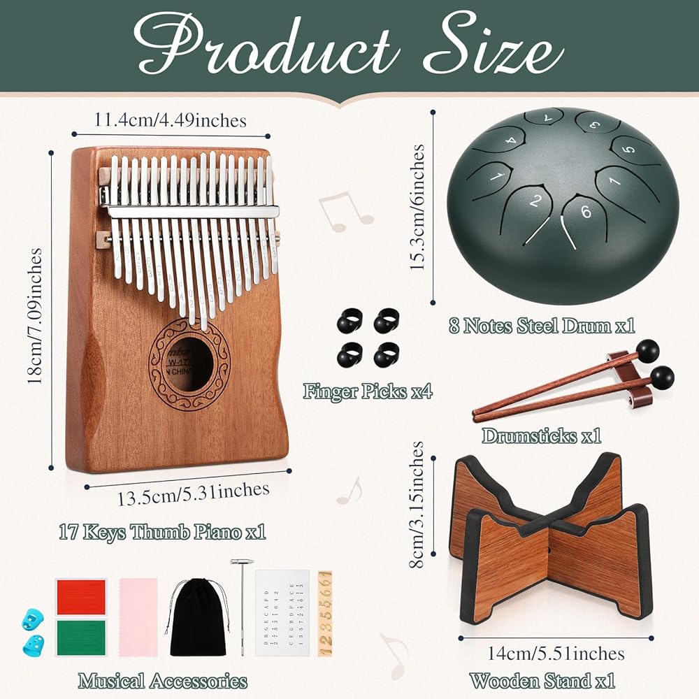 The compact size of the 17 key thumb piano and the 6 inches steel drum make them your ideal travel companion. Whether you're partying, camping, or just looking to relax on a vacation, you can carry these along to enjoy melodies and bring joy to friends and family, anywhere, anytime.
