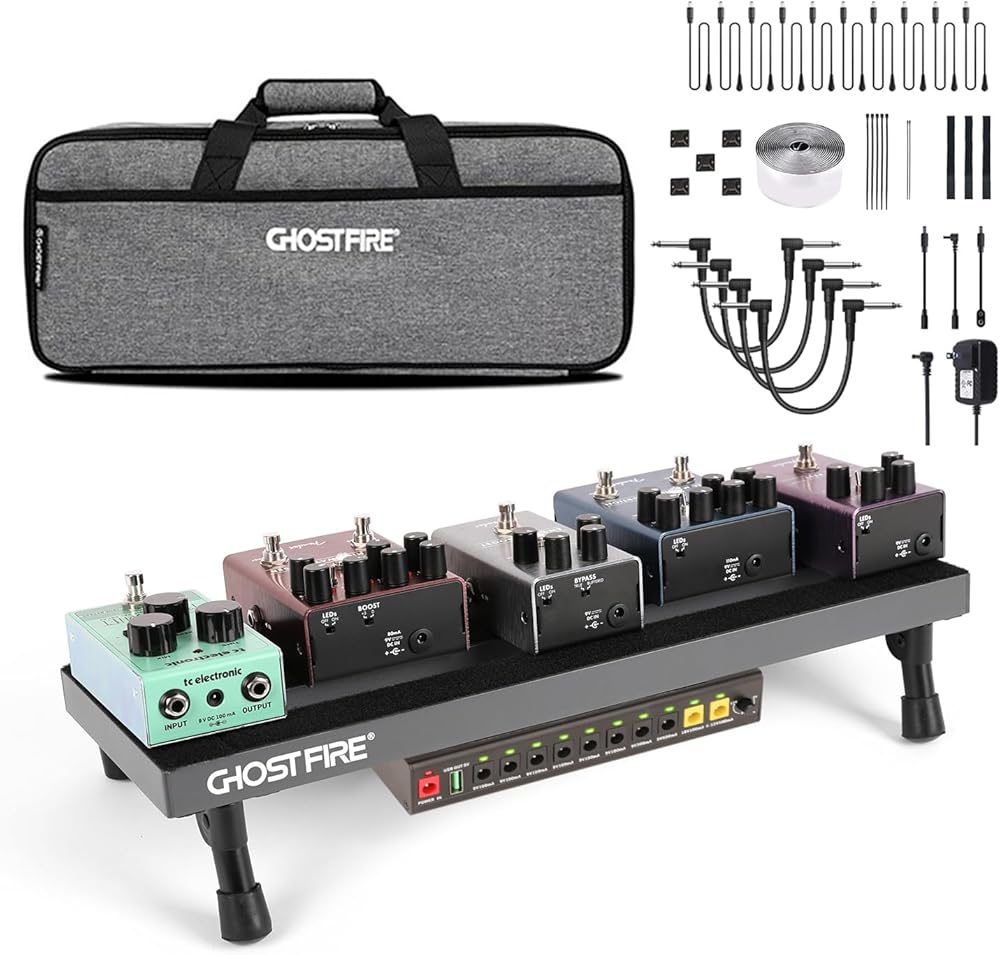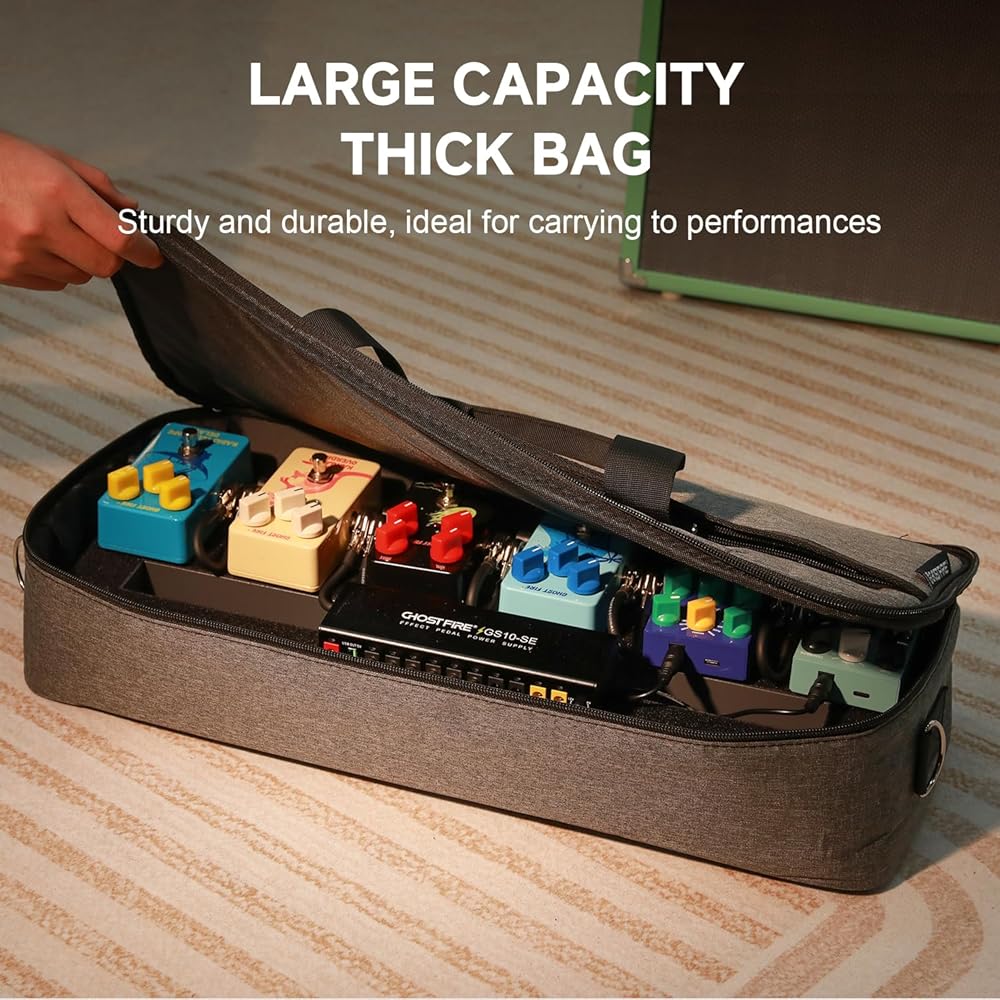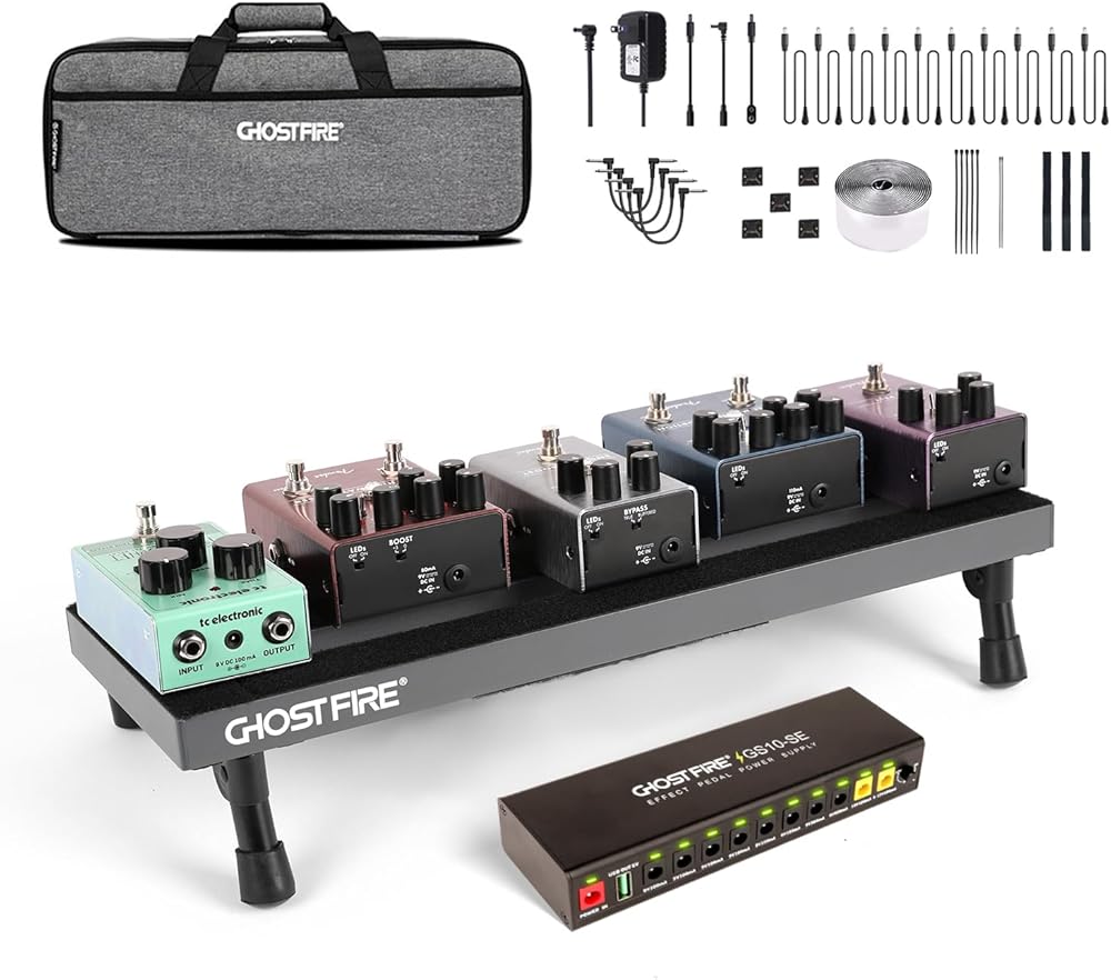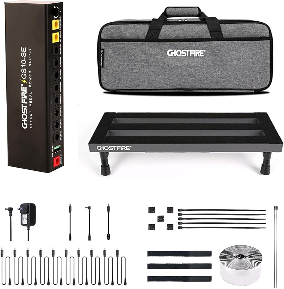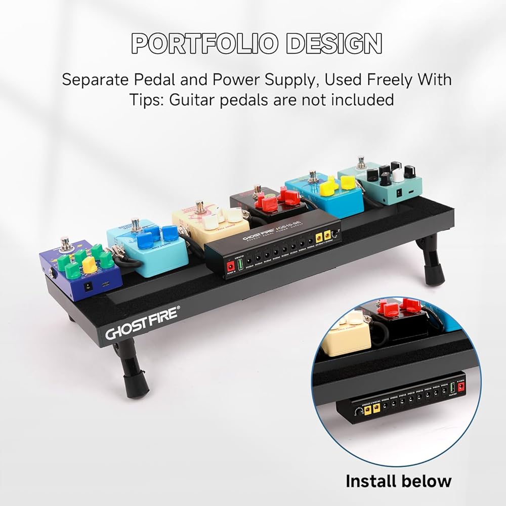 【Product Specifications】The Ghost Fire S series effects pedal board, crafted from ultra-lightweight aluminum alloy, weighs just 1.76 lbs and measures 19.8''x11.5'', accommodating 8-10 effect pedals with ample space beneath.Paired with the GS10-SE Output Pedal Power Supply, it includes a power supply unit, 10 DC cables (50cm), a reversed polarity adapter, an extension cord, a 3.5mm converter, and an 18V 1000mA adapter.