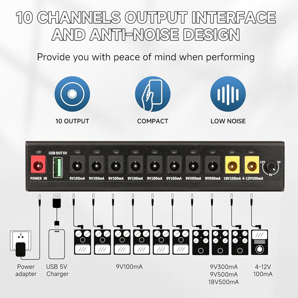 【Versatile and Reliable Power Supply】The GHOSTFIRE GS10-SE Pedal Power Supply offers 10 isolated output channels, ensuring stable and reliable operation for up to ten effects simultaneously. It includes 1 channel at 9V1000mA, 5 channels at 9V100mA, 2 channels at 9V300mA, and 2 adjustable voltage channels (9V/12V/18V500mA). This setup allows for noise reduction through isolation and voltage adjustment, catering to a wide range of pedal power requirements.