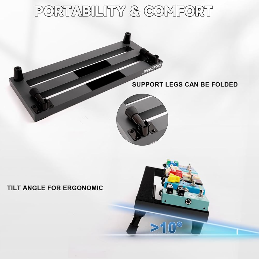 【Ergonomic and Portable】 Featuring an ergonomic, patented design, the pedal board tilts for easy access during use. The unique foot stand can be conveniently folded back into the included large capacity storage bag when not in use, making it ideal for travel. This versatile bag, which can be carried as a handbag or shoulder bag, or attached to a suitcase, also includes internal straps for securing the board and an external side pocket for cables.