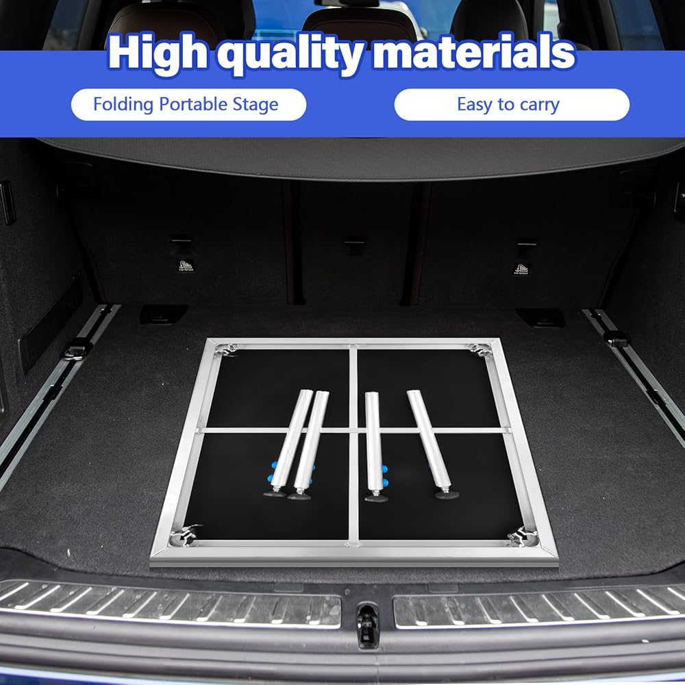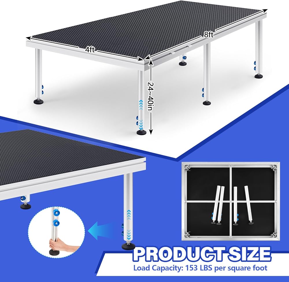 Compact portable stage including strong yet lightweight aluminum alloy length-adjustable riser with leg levelers for uneven surface, easy to transport and store.