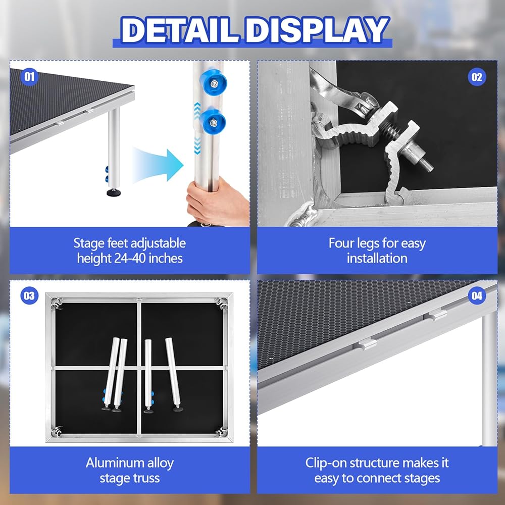 The mobile stage platform allows one man operation for fast, easy, and ensures the platform is securely fastened onto the riser for safety. If you need to adjust the height, an wrench is required. (Not included)
