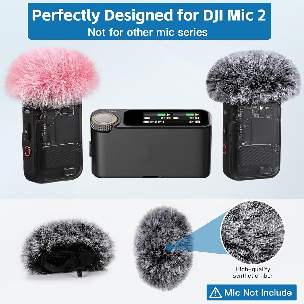 【Included in Package】6 × Furry Windscreen Cover (2 White, 2 Gray, 2 Pink). Dimensions: 3.15inW x 0.8inH. PLEASE NOTE: DJI MIC 2 MICROPHONE NOT INCLUDED.