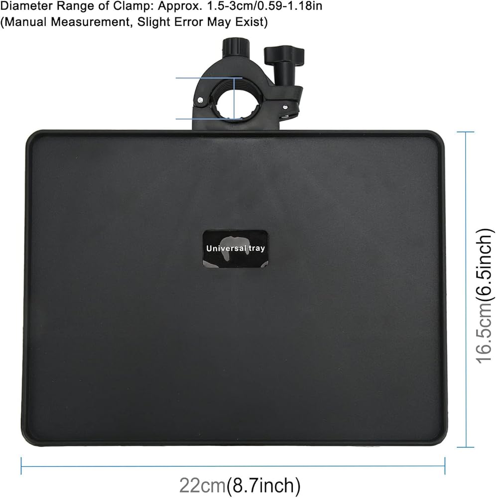 Tray Size: The length and width of the microphone stand tray are 6.50in and 8.66in, and the diameter range of its clamp is from 0.59in to 1.18in.