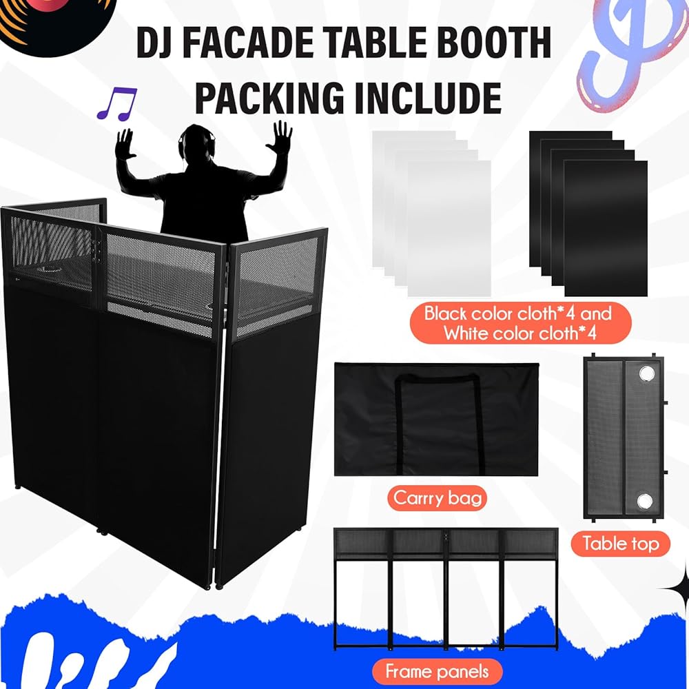 Portable DJ Facade Booth, Foldable DJ Table Station With White & Black Lighting Scrim,50"L x48" Hx 25"W DJ Stand Booth,With Adjustable DJ Event Facade Feet for Party, Black Metal Frame (52x 43.2 x 26)