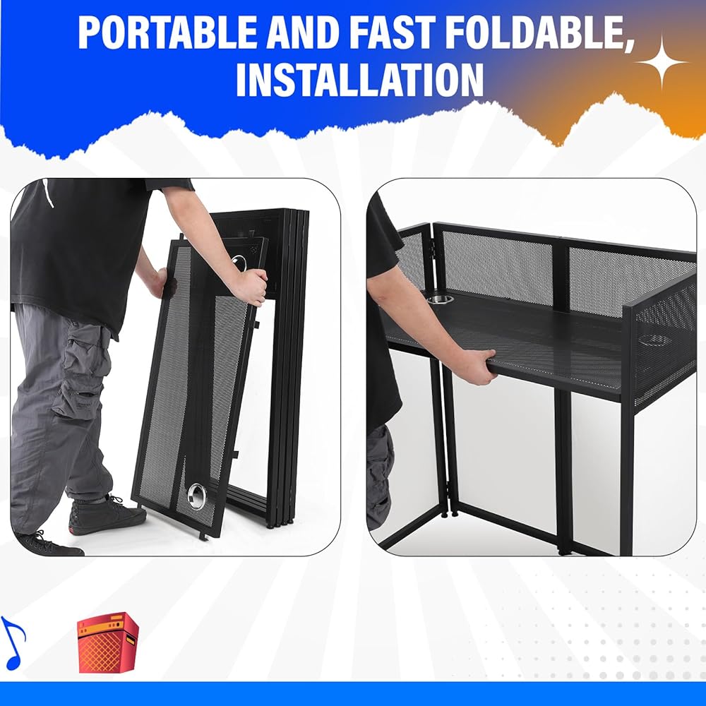 【Multifunctional DJ Facade Booth】DJ table is 52"L x 26" W, which is enough to accommodate your DJ devices such as monitoring speakers, DJ controller, mixer,and laptops. A flat mesh panel can help you quickly see under the table. There are two built-in holes available for all cable management, so you can keep your workspace clean and organized, giving you a clean look to suit your DJ needs. Ideal for use on stage or in a studio.