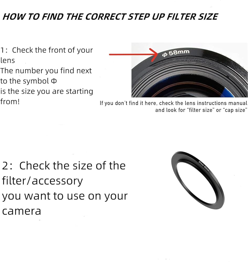 【Please note】:How do I find my filter thread size? Your lens thread size will be printed underneath your lens cap or written somewhere on the lens barrel, Find the size of the lens and then the size of the adapter you need,Refer to the picture and the video tutorial to buy the corresponding size.