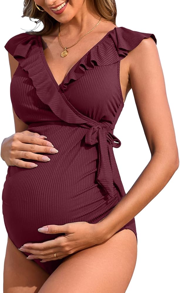 Ribbed Maternity Swimsuit: Ruffle v neck, side bow knot easy for mothers to care for their little ones with ease, enough support and great coverage of the breasts, ruched and stretchy for growing belly, full coverage in bottoms