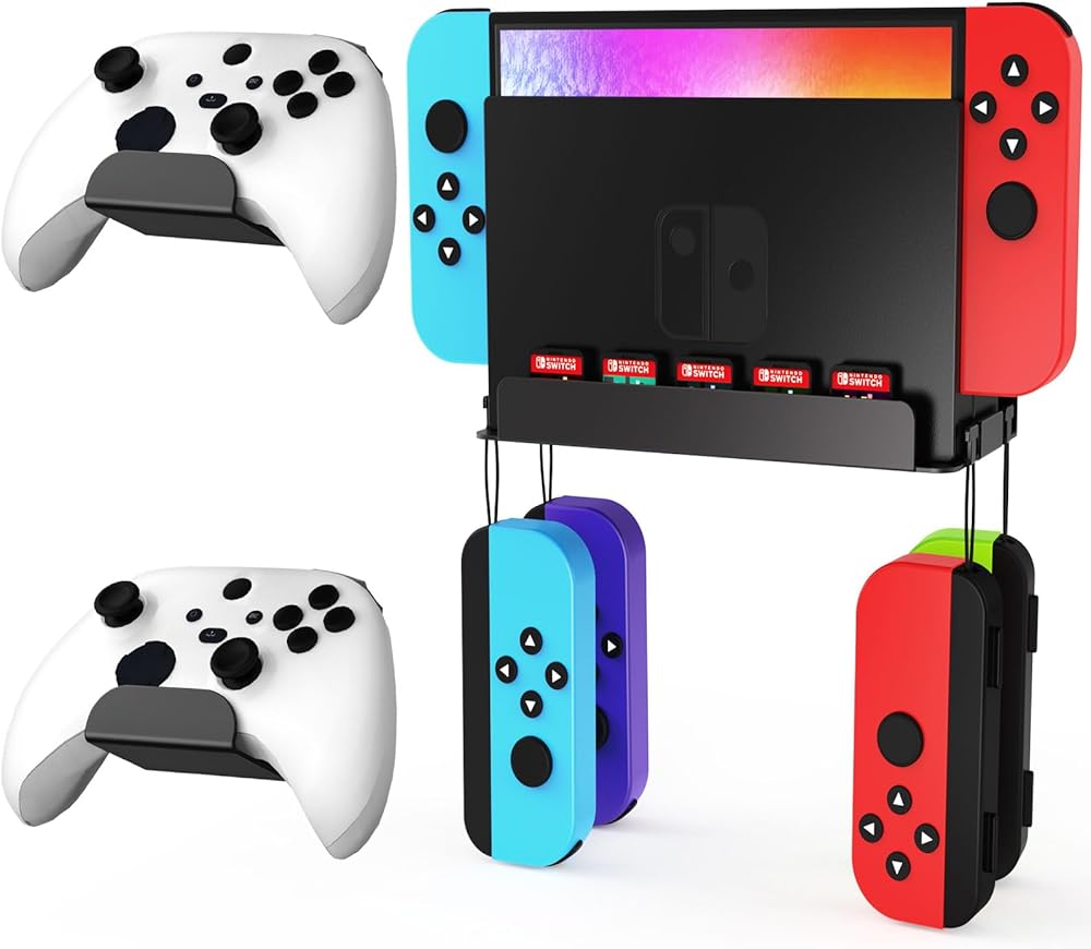 Maximize Space Savings - The Wall Mount Kit compatible for Switch features 5 game card slots and 4 T-Shaped Joy Con Hooks. 5 game card slots are convenient for storing and displaying your favorite games, and the 4 T-Shaped Joy con Hooks are designed to prevent accidental slipping.