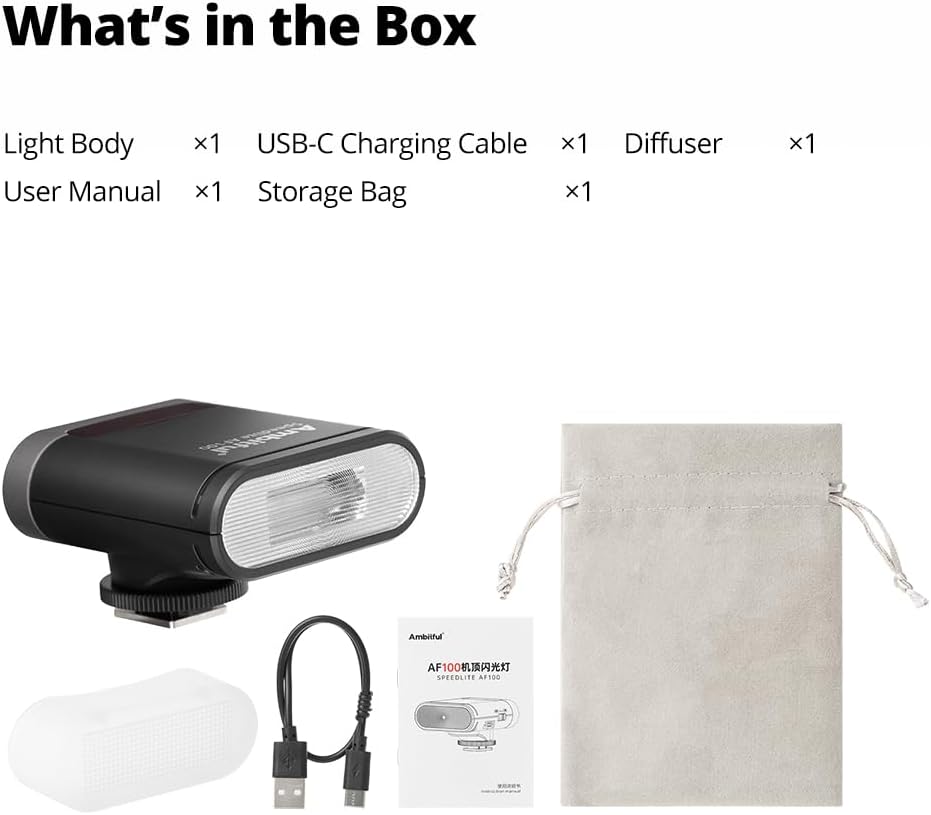 【Package Included】AMBITFUL AF970 camera flash weights only 390g/0.86lb , with dimension 6*20.5*7.5cm/2.36*8.07*2.95 inch. The pacakge includes: camera flash*1, mini stand*1 diffuser*1,storage bag*1,extral 12pcs gel light filter