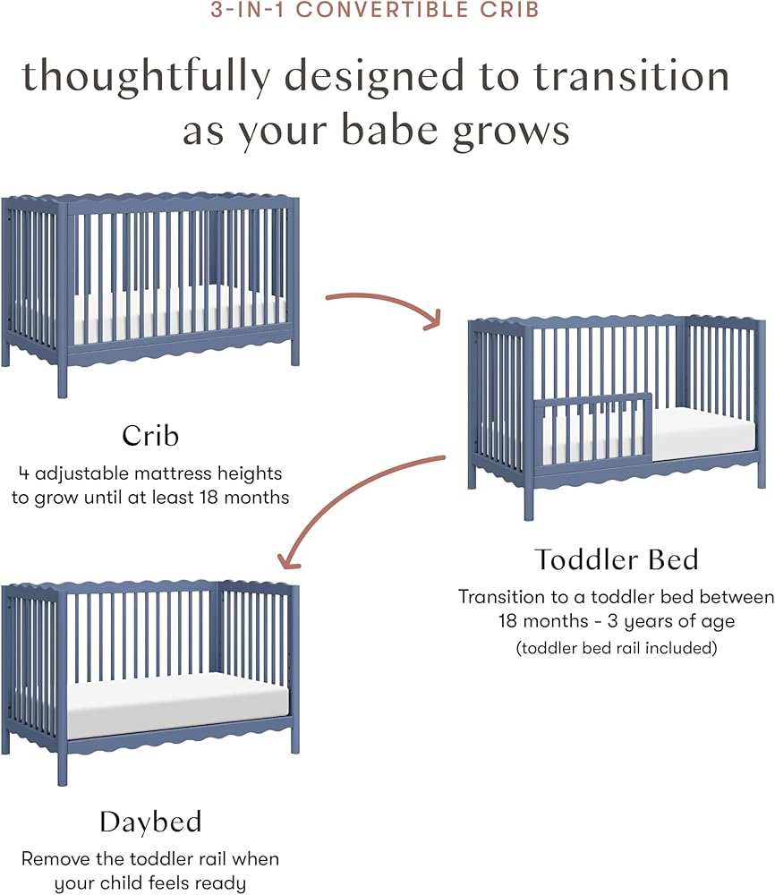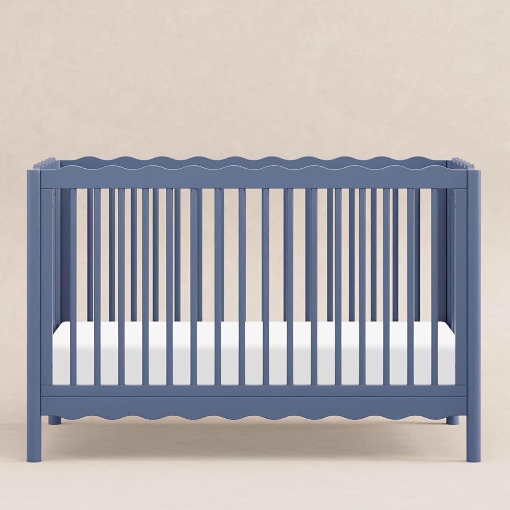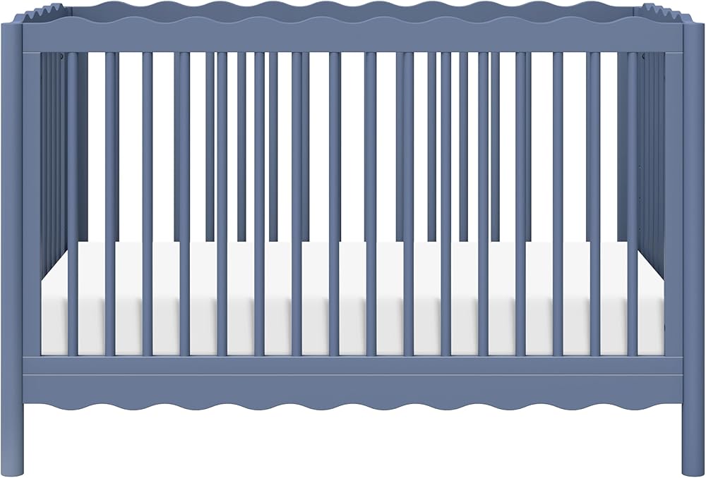 Dive into a world of playful charm with the Swell 4-in-1 Convertible Crib! It's practical and playful with wave-like railings, an included toddler bed conversion kit, and the option to add a full-sized bed conversion kit.