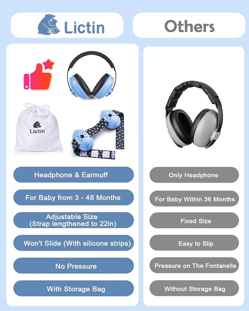 2-in-1 Design: Lictin toddler ear protection features a flexible 2-in-1 design with soft, stretchy headbands and adjustable traditional headphones, they ensure a snug fit. The lightweight build reduces pressure on your baby's head and neck, allowing optimal comfort during long wear