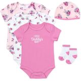 DADDY'S GIRL 5 PIECE BODYSUIT SET: Contains (3) short sleeve, snap closure bottom bodysuits for easy on and off access for diaper changes including (1) “Daddy's Girl” scripted, (1) Daisies and (1) Vine and Floral Printed, along with (1) matching Vine and Floral printed, blush pink / daisy printed trim cap and (1) pair of blush pink and white bootie ankle socks.