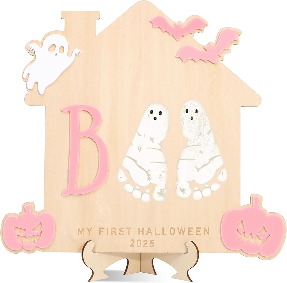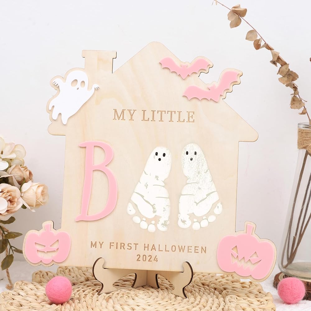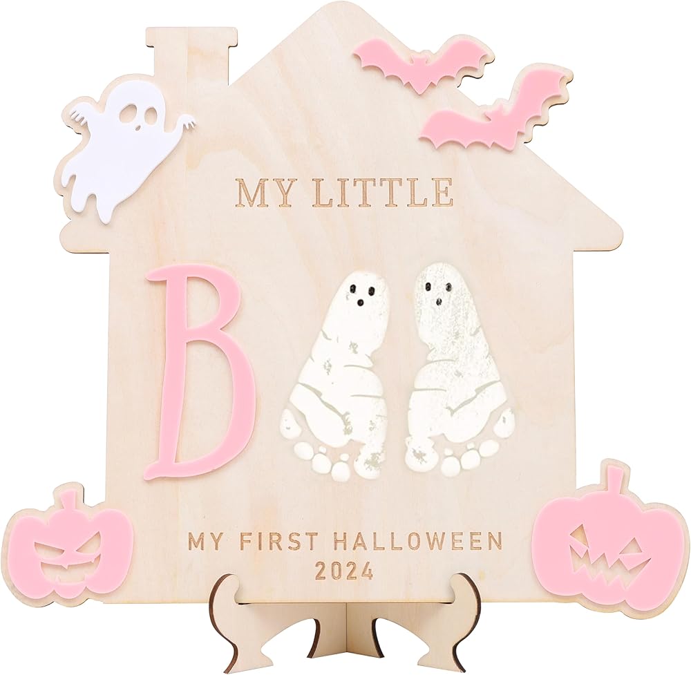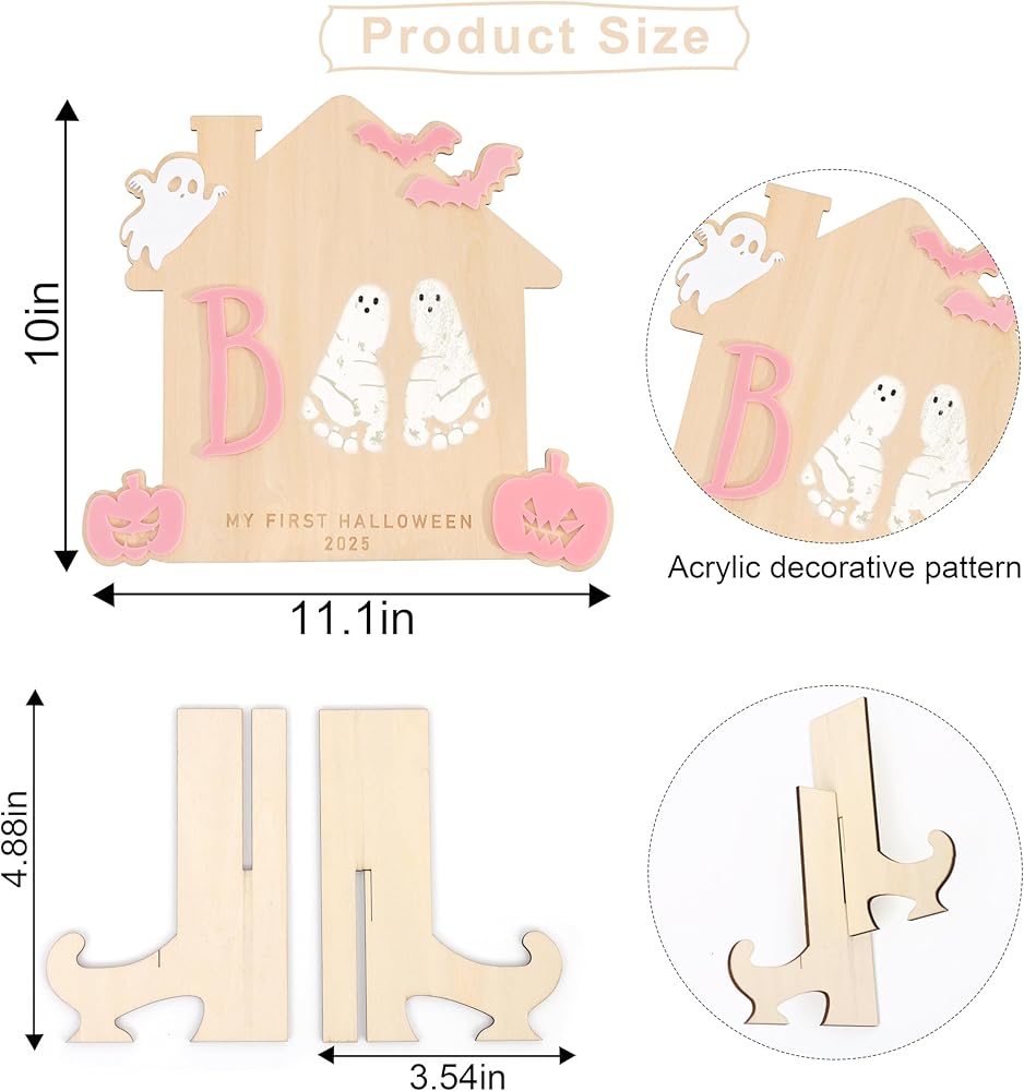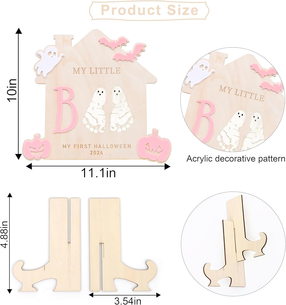 Celebrate your child's first Halloween with the stylish and charming Children's Handprint and Footprint Sign, a fun and creative DIY project! It's made from good wood and is great for capturing those precious little footprints or handprints.