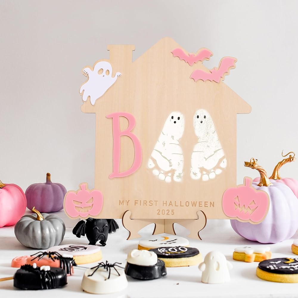 FOOTPRINT OR HANDPRINT SIGN: If you want to leave an adorable mark on your child's first Halloween, then this stunning spooky bat handprint footprint art wooden board is a great choice for sweet memories