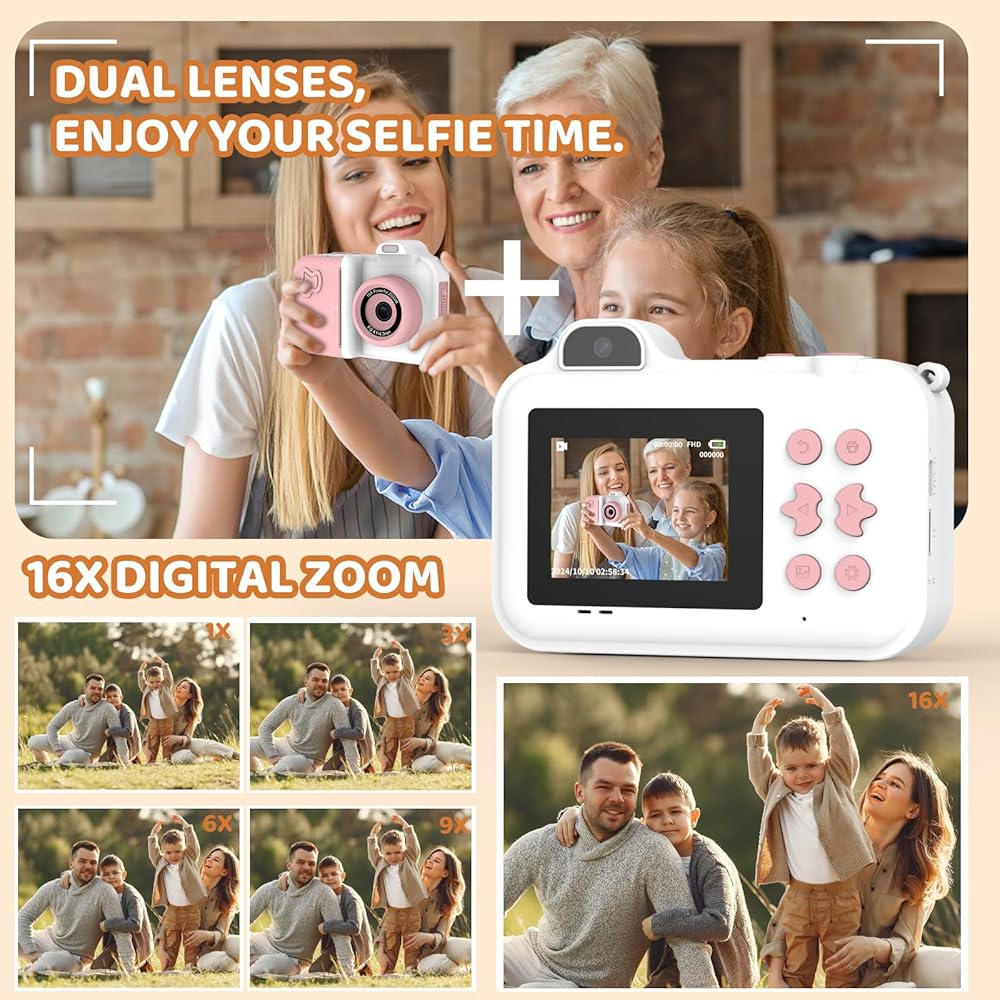 High-Definition 1080p Video Recording – Equipped with a 16x powerful zoom ,allows children to zoom in and explore their surroundings in stunning detail, encouraging their creativity and imagination.Not only can kids take vibrant pictures, but they can also record high-definition 1080p videos. This feature allows children to capture both still moments and dynamic adventures, making it the perfect tool for documenting their daily life.