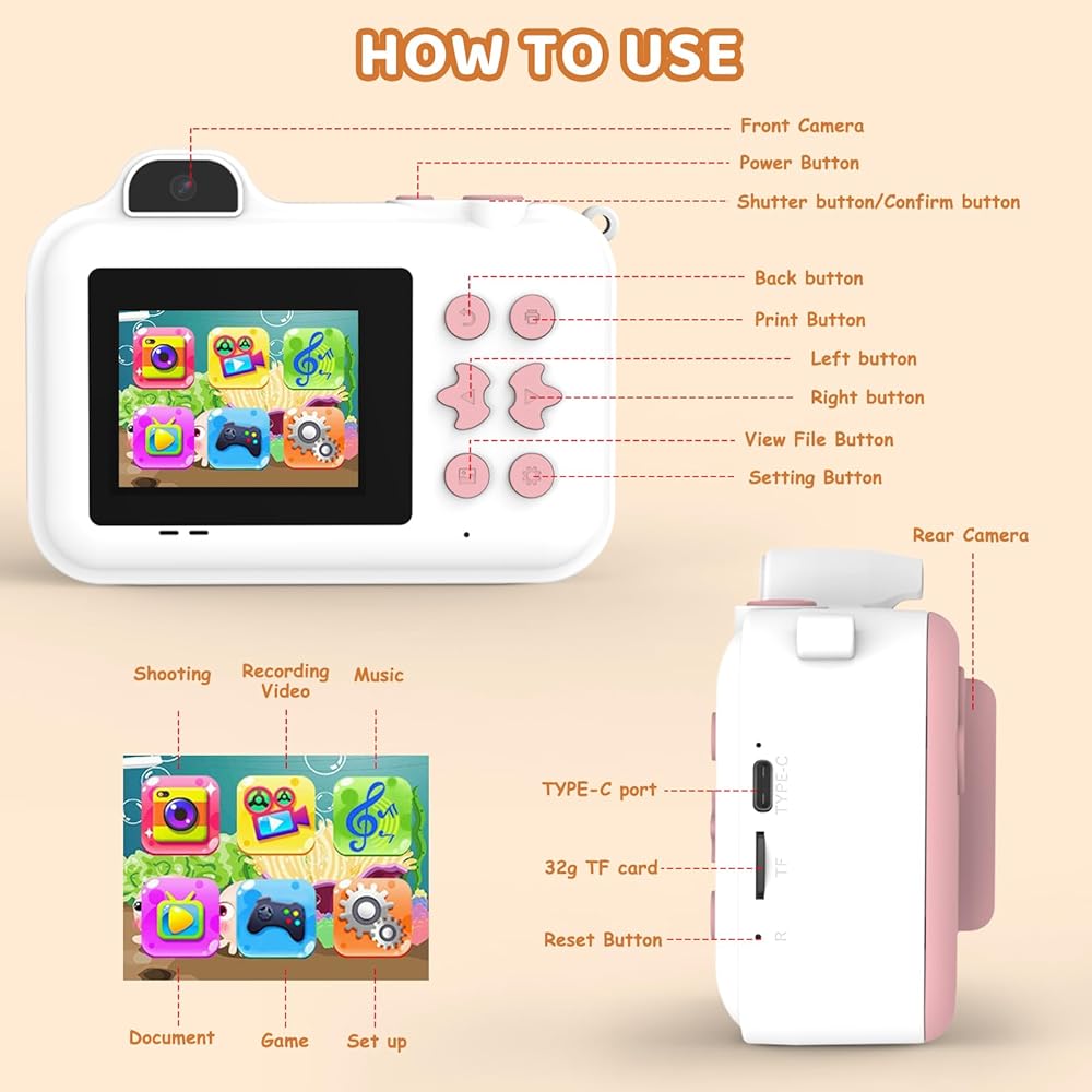 Multifunctional kids Instant Print Camera – This kids' camera offers more than just photo-taking. It serves as both a digital camera for capturing colorful images and a print camera that instantly prints black & white photos, enhancing creativity and offering endless fun.