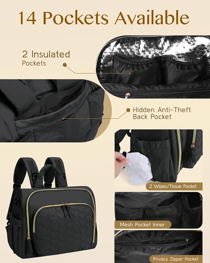 Well organized & Enough capacity: This small diaper bag breaks away from the usual bulky appearance while providing ample capacity. It measures 15" L x 12" W x 6.3" H and features 4 functional compartments. The front pocket includes 2 insulated pockets for storing milk bottles, the main compartment has 7 pockets for organization, and a back pocket to hide the shoulder straps. Besides 2 side pockets for easy access to wipes/bottle.