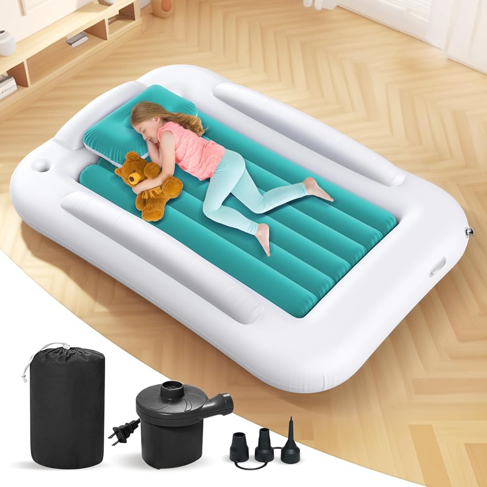 【Versatile for Any Occasion】One of the standout features of this baby air mattress with sides is its versatility. It's perfect for a variety of situations—whether you're at home, traveling, camping, or heading to a sleepover. The included carry bag ensures that you can take the portable toddler bed for travel with you wherever you go, making it an excellent option for families who travel frequently. Its lightweight design allows for easy transportation, and the compact size when deflated means it takes up minimal space in your luggage or car.