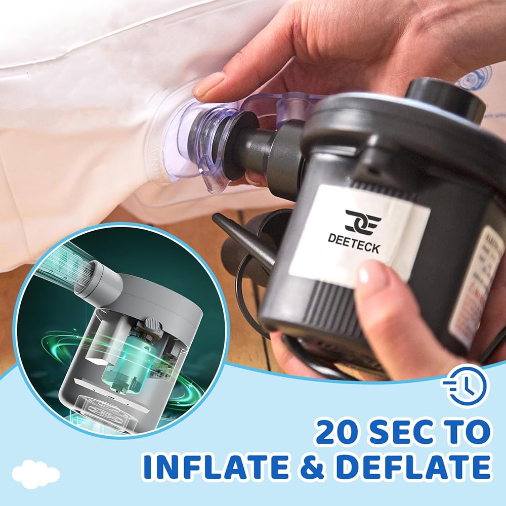 【Easy Inflation】Convenience is key when it comes to inflatable travel bed for kids, and this kids air mattress makes the inflation process simple and fast. It comes equipped with a high-efficiency air pump with three different nozzle sizes that allows the baby air mattress to be fully inflated in just minutes. This flexibility makes it a multifunctional tool for families, allowing them to use it beyond the bed itself. Deflating the bed is equally simple, and it can be rolled up and stored in its accompanying carry bag.