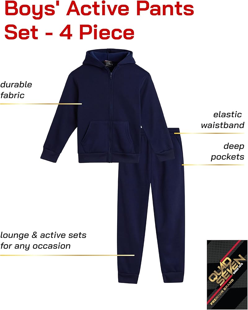 VERSATILE DESIGN: This jogger set is a must-have for any kid's wardrobe, offering multiple outfit combinations with its 4-piece design. Whether he's wearing the boys zip up hoodie with boys joggers or mixing and matching with other boys clothes, this set is perfect for all seasons. With a focus on boys' activewear, the Quad Seven Boy's Jogset is great for playdates, school, or casual outings, making it a versatile addition to boys' clothing collections.