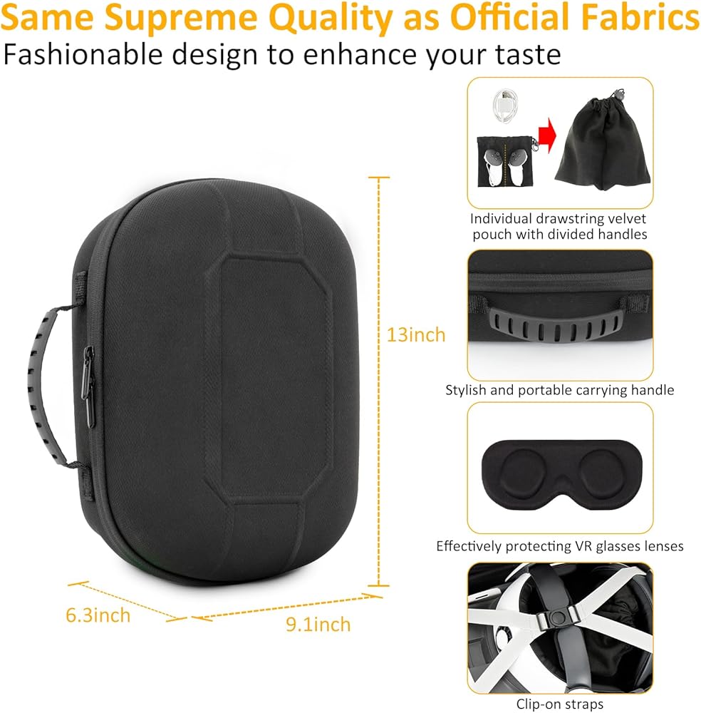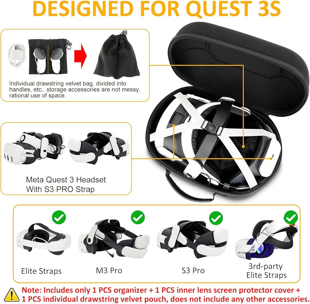 【Ample Space】Perfectly compatible with Meta/Oculus Quest 3S/Quest 3 with Elite Strap. Independent drawstring velvet bag, packaging handle, etc., make reasonable use of space, and store accessories in an orderly manner