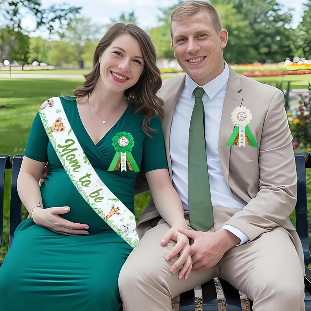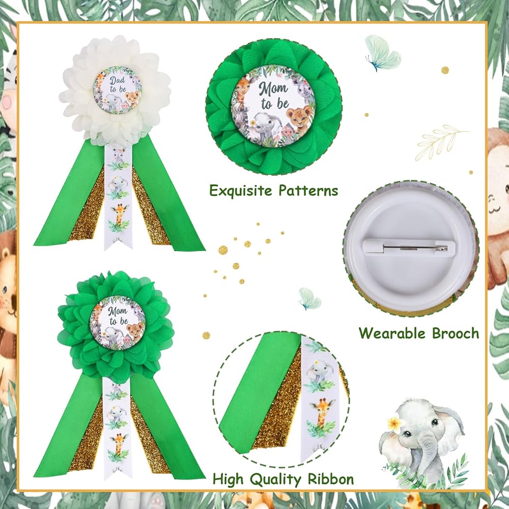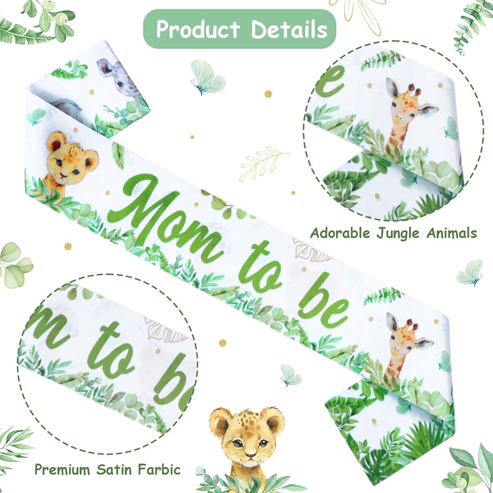 Package Content: This package contains 1 jungle animals Mom to be sash 3.7x63 inches, 1 jungle theme Mom to be pin, 1 jungle theme Dad to be pin, 1 flower wreath headband.