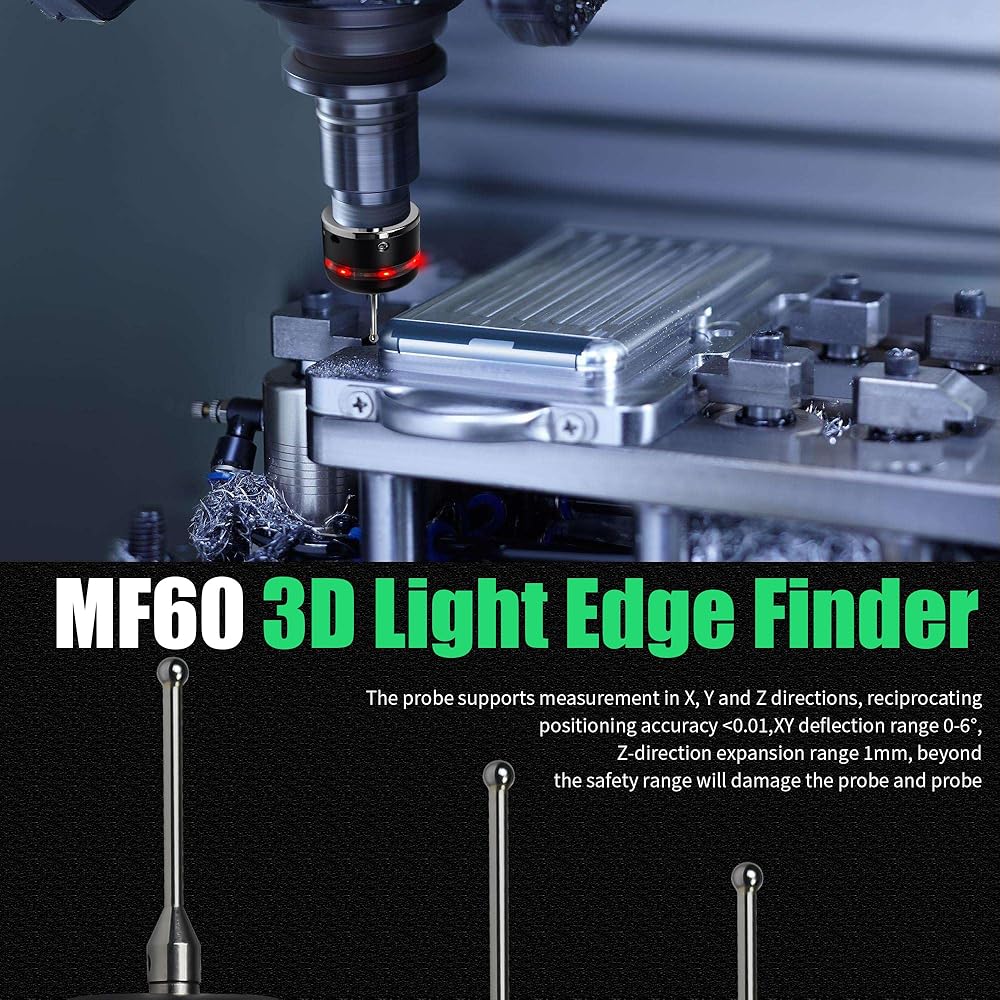 【Functions】⑴MF60 edge finder is designed to measuring the edges, holes, studs, angles, corners, etc. with high accuracy; ⑵ Connect GND and the output signal line. After the host computer obtains the signal, the macro program will realize the functions of automatic centring and recording of coordinates;⑶Offline Working Can be used as a photoelectric centring rod;⑷supports X, Y, Z three-direction measurement, reciprocating positioning accuracy ≤ 0.01, XY deflection range 0-6 °, Z-direction telescoping range of 1mm, beyond the safety range will damage the probe and the probe