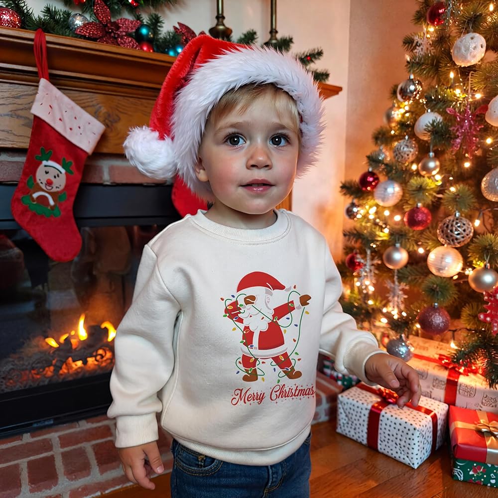 This adorable toddler Christmas sweatshirt is sure to spread holiday cheer! The long-sleeved pullover top features a playful snowman face design, complete with big googly eyes, a carrot nose, and a cheerful smile. Made from a soft and cozy material, this sweatshirt will keep your little one warm and comfortable all season long. Perfect for festive family photos, holiday parties, or just lounging around the house, this sweatshirt is a must-have for any child's winter wardrobe. The relaxed fit allows for easy movement and layering, while the classic snowman motif adds a touch of whimsy. Available in a range of sizes to fit babies and toddlers, this sweatshirt makes a great gift or addition to your child's clothing collection.