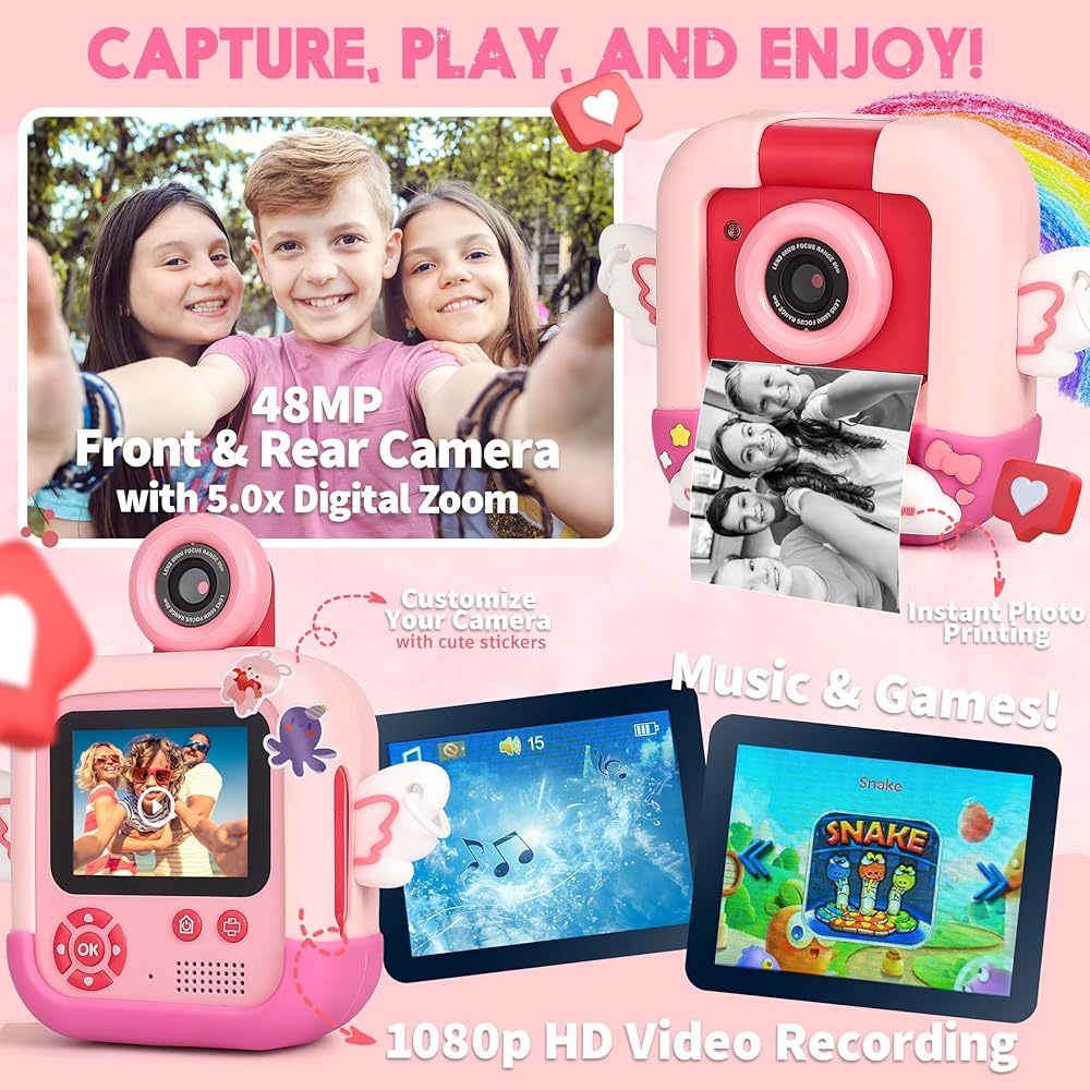Capture Memories, Play Games & Enjoy Life: Apply silly filters & effects while using the kids print camera's front & rear camera (5X digital zoom). Instant print black & white photos or store full color video recordings (1080p HD) along with the included music & games on a 32gb memory card.