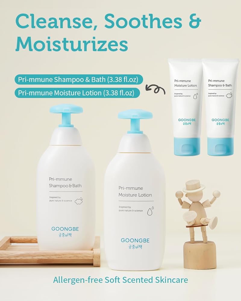 Essential Baby Skincare Duo: Discover the perfect combination for your baby's skincare routine with the GOONGBE Pri-mmune set, featuring 100ml Baby Shampoo & Bath and 100ml Baby Moisture Lotion. Each product is designed to provide gentle and effective care, ensuring your baby's skin and hair are clean, hydrated, and beautifully nourished.