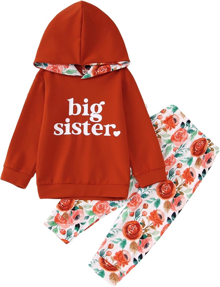 【What You Get】1pc long sleeve toddler big sister hoodie pullover sweatshirt top + 1pc floral pants (two-piece sweatsuit set big sister outfit for toddler girls). Please check the cute baby girl clothes' size chart in the listed picture before purchasing.