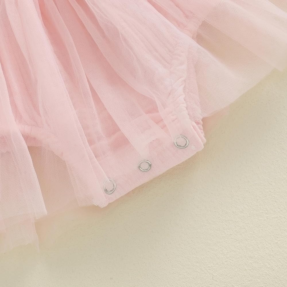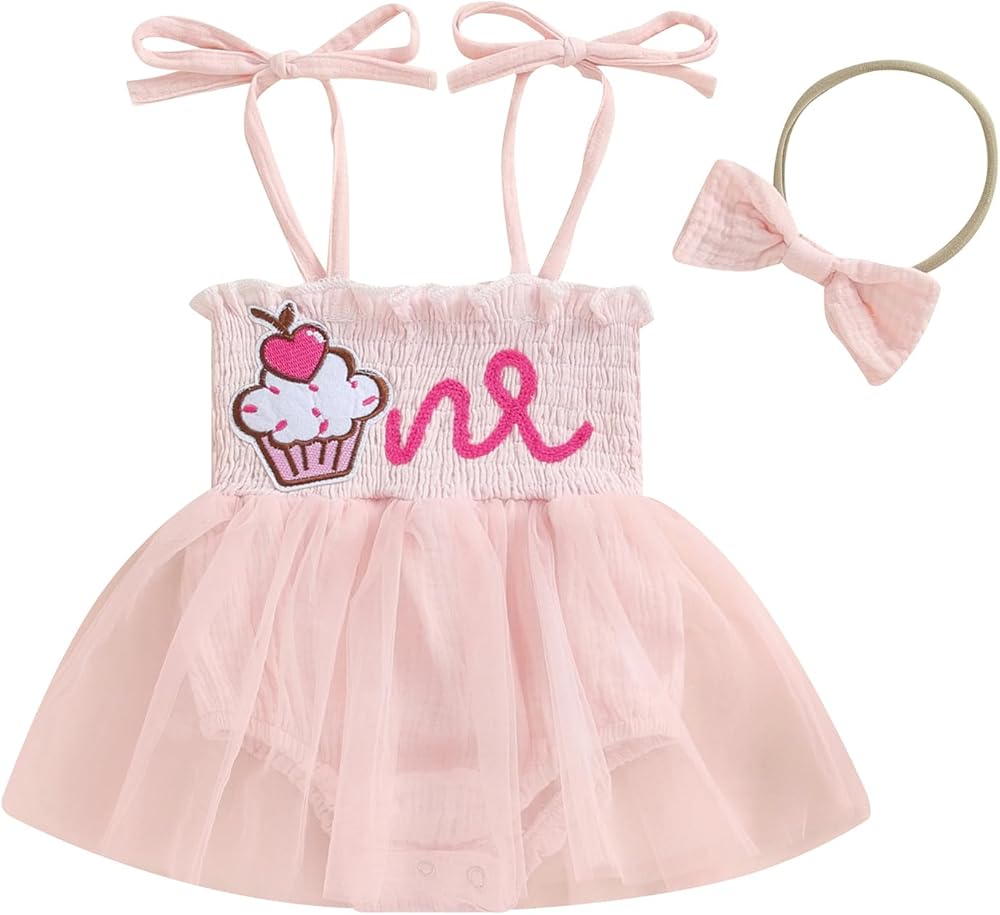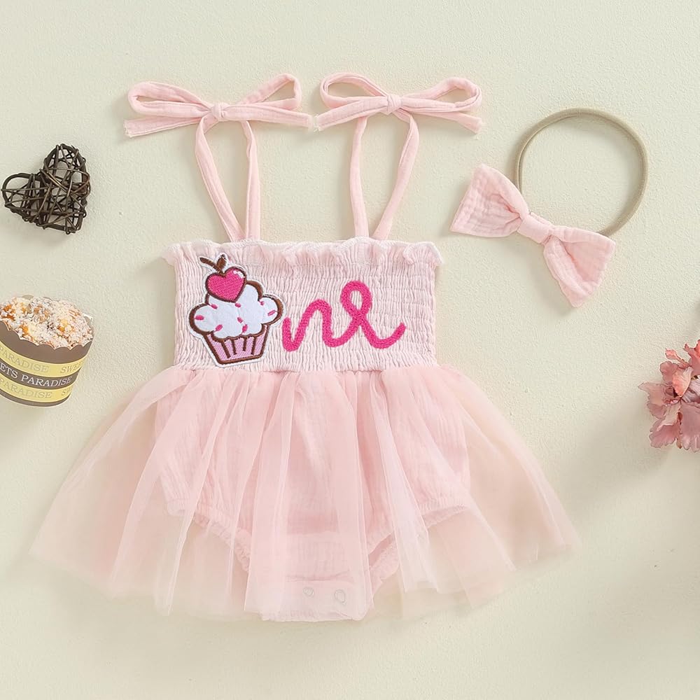 Little girl romper, baby girl romper dress, letter embroidery, mesh patchwork, bandage straps and sleeveless, and cute headband set, your little one wearing it will receive a lot of compliments.
