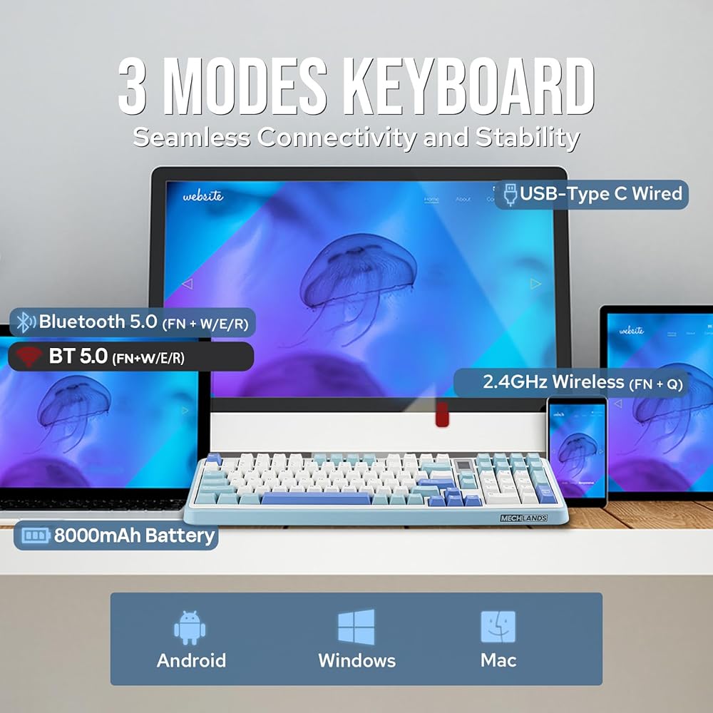 【Tri-Mode Connectivity with 4000mAh Battery】 The Vibe99 is built for versatility with tri-mode connectivity options, including USB-C wired, 2.4GHz wireless, and Bluetooth 5.0 connections. Whether you're gaming, working, or simply browsing, this wireless keyboard offers seamless connectivity and stability. The robust 4000mAh battery ensures extended wireless usage, minimizing the need for frequent recharging and keeping you focused on your tasks.